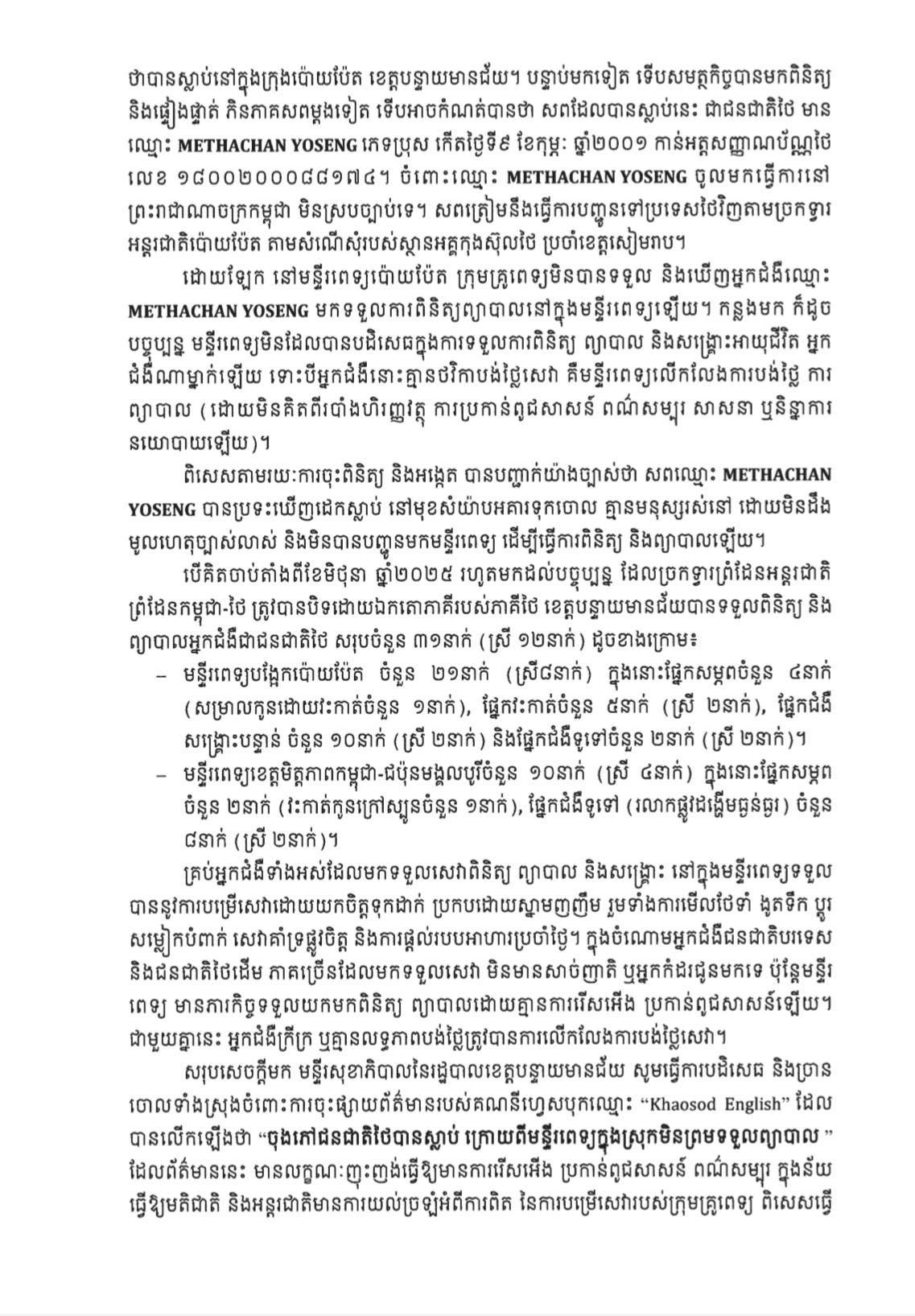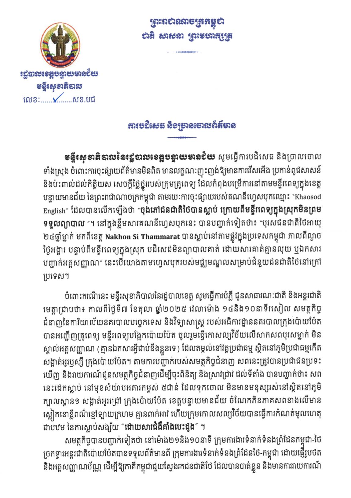 នៅថ្ងៃទី៨ ខែតុលា ឆ្នាំ២០២៥ រដ្ឋបាលខេត្តបន្ទាយមានជ័យ ចេញលិខិតបដិសេធ និងចោលចោលទាំងស្រុង ចំពោះការចុះផ្សាយព័ត៌មានមិនពិត មានលក្ខណៈញុះញង់ឱ្យមានការរើសអើង ប្រកាន់ពូជសាសន៍ និងប៉ះពាល់ដល់កិត្តិយស សេចក្តីថ្លៃថ្នូររបស់ក្រុមគ្រូពេទ្យ ដែលកំពុងបម្រើការនៅតាមមន្ទីរពេទ្យក្នុងខេត្តបន្ទាយមានជ័យ នៃព្រះរាជាណាចក្រកម្ពុជា តាមរយៈការចុះផ្សាយរបស់គណនីហ្វេសប៊ុកឈ្មោះ Khaosod Englishដែលបានលើកឡើងថា ចុងភៅជនជាតិថៃបានស្លាប់ ក្រោយពីមន្ទីរពេទ្យក្នុងស្រុកមិនព្រមទទួលព្យាបាល។