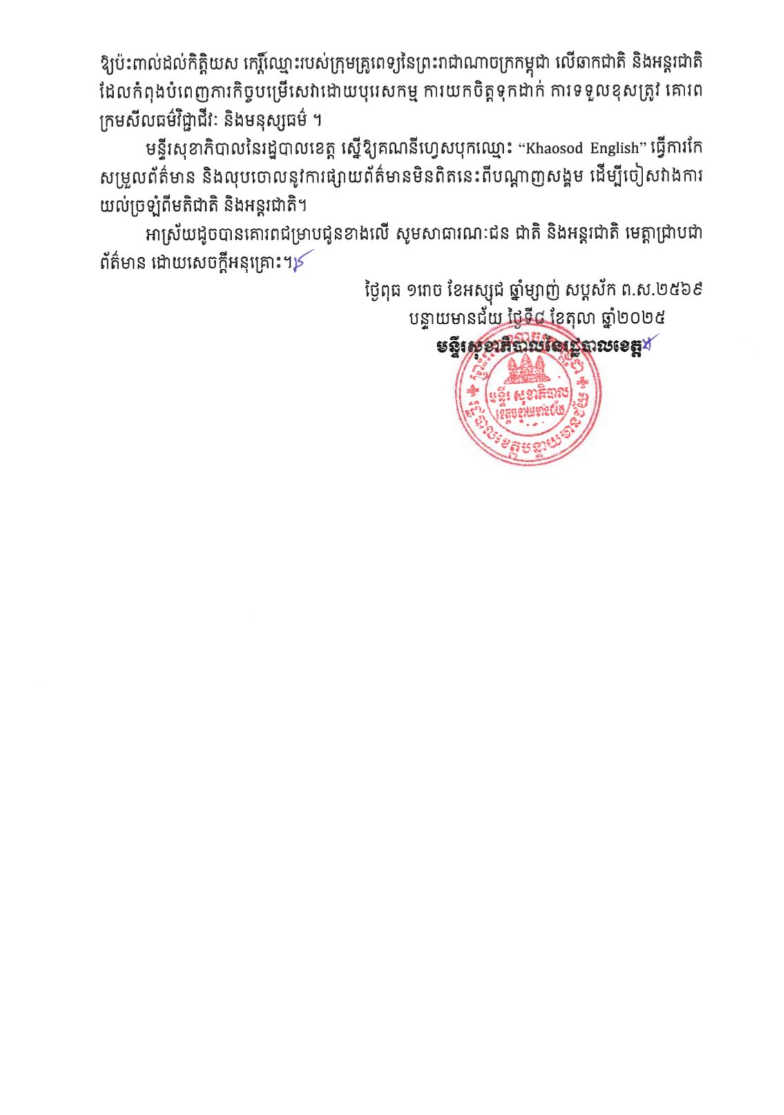 ជាមួយគ្នានោះផងដែរ មន្ទីរសុខាភិបាលនៃរដ្ឋបាលខេត្តបន្ទាយមានជ័យ ក៏បានស្នើឱ្យគណនីហ្វេសប៊ុកខាងលើ ធ្វើការកែសម្រួលព័ត៌មាន និងលុបចោលនូវការផ្សាយព័ត៌មានមិនពិតនេះពីបណ្តាញសង្គម ដើម្បីចៀសវាងការយល់ច្រឡំពីមតិជាតិ និងអន្តរជាតិ៕
