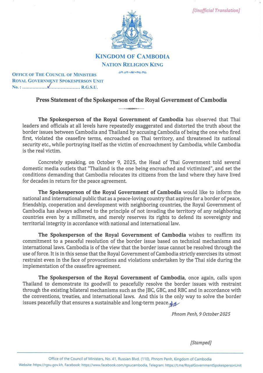 The Spokesperson of the Royal Government of Cambodia wishes to reaffirm its commitment to a peaceful resolution of the border issue based on technical mechanisms and international laws.