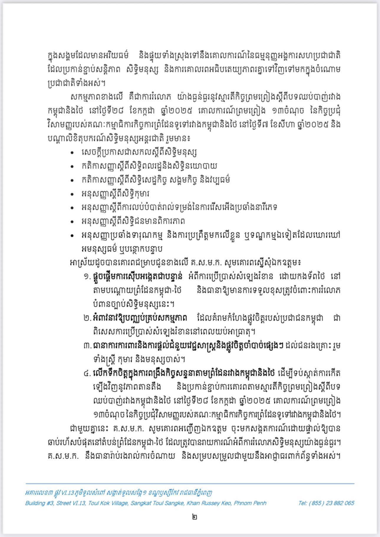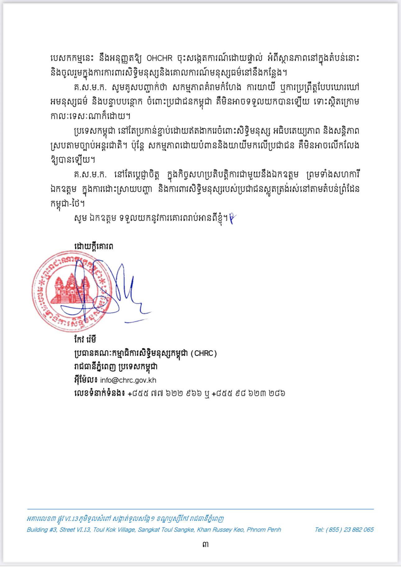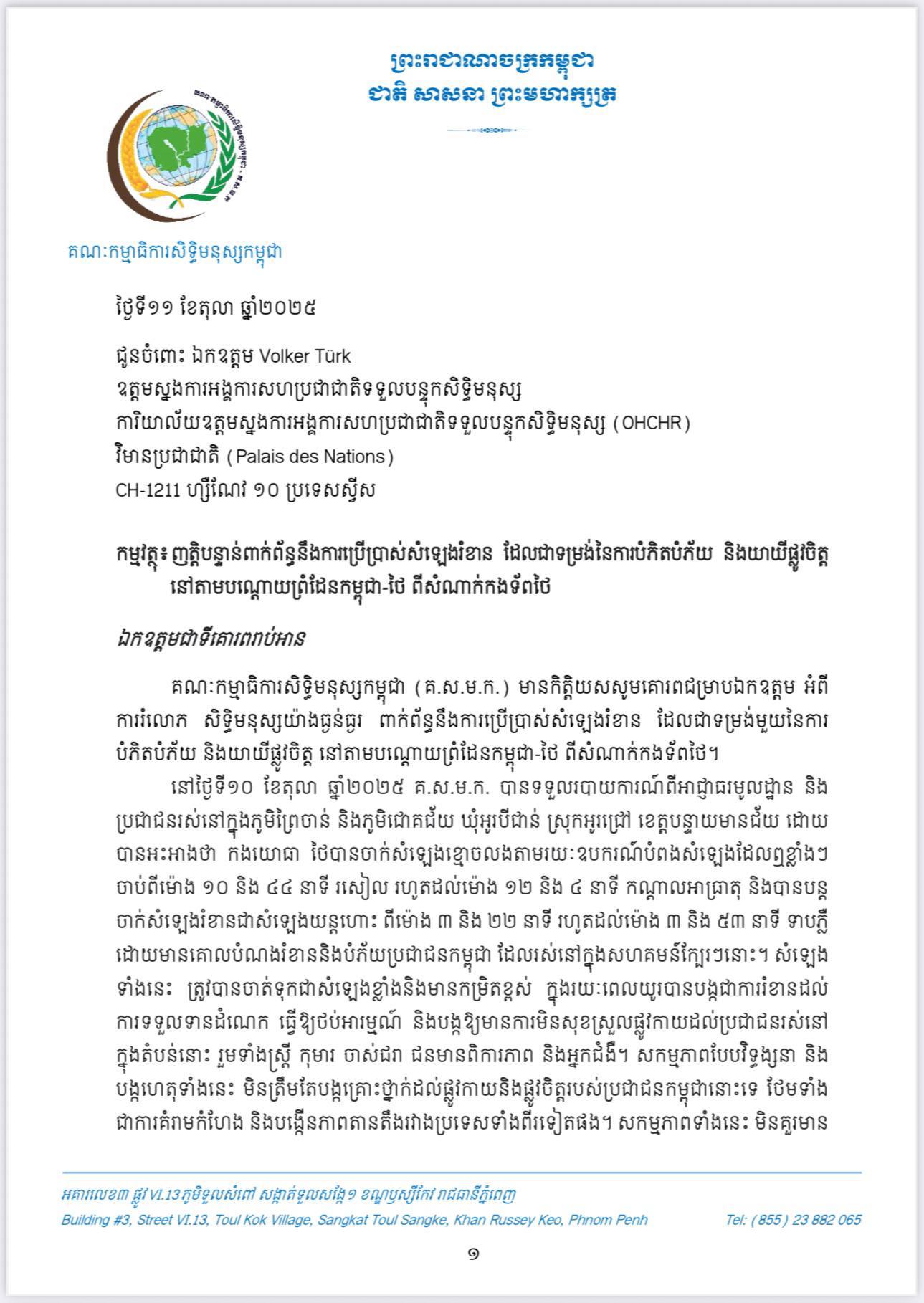 ប្រធានគណៈកម្មាធិការសិទ្ធិមនុស្សកម្ពុជា ផ្ញើញត្តិបន្ទាន់ជូន ឯកឧត្តម Volker Türk ឧត្តមស្នងការ (OHCHR) ពាក់ព័ន្ធនឹងការប្រើប្រាស់សំឡេងរំខាន ដែលជាទម្រង់នៃការបំភិតបំភ័យ និងយាយីផ្លូវចិត្ត នៅតាមបណ្តោយព្រំដែនកម្ពុជា-ថៃ ពីសំណាក់កងទ័ពថៃ