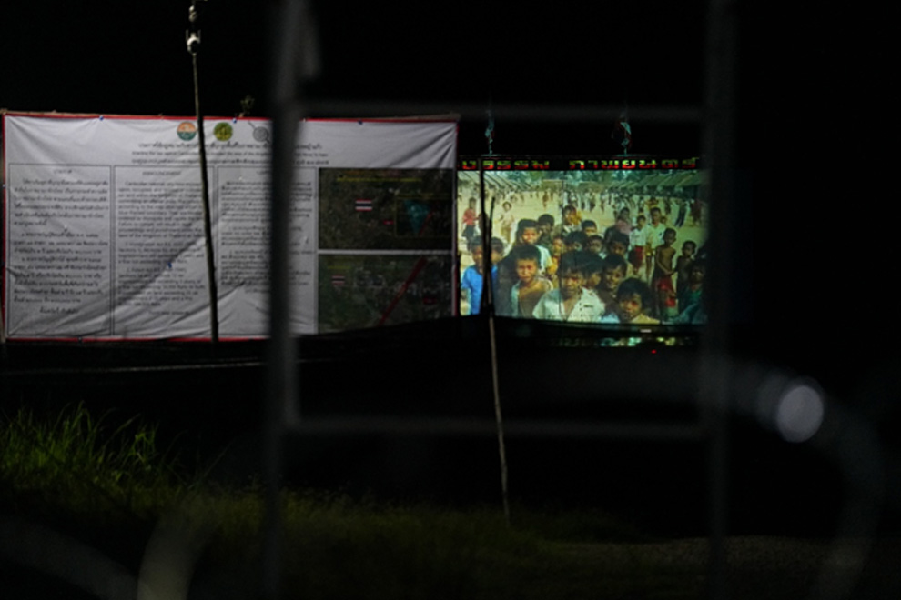Photo: A large screen broadcasts videos into the Cambodian village of Prey Chan, from behind a Thai barricade. AKP