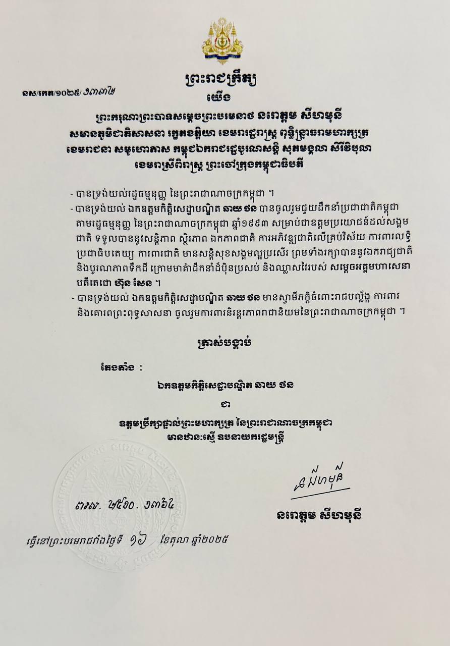 ព្រះមហាក្សត្រ ចេញព្រះរាជក្រឹត្យត្រាស់បង្គាប់តែងតាំង លោកកិត្តិសេដ្ឋាបណ្ឌិត ឆាយ ថន ជាឧត្តមប្រឹក្សាផ្ទាល់ ឋានៈស្មើឧបនាយករដ្ឋមន្ដ្រី