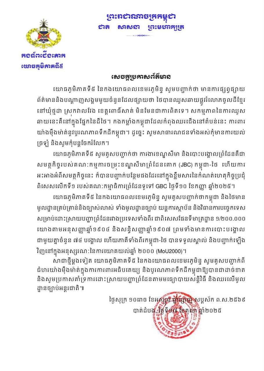 យោធភូមិភាគទី៥ នៃកងយោធពលខេមរភូមិន្ទ ច្រានចោលការផ្សព្វផ្សាយព័ត៌មាន និងបណ្តាញសង្គមមួយចំនួនដែលថា «ថៃបានឈូសឆាយផ្លូវរំលោភចូលដីខ្មែរ នៅឃុំថ្មដា ស្រុកវាលវែង ខេត្តពោធិ៍សាត់ គឺមិនមែនជាការពិតទេ»