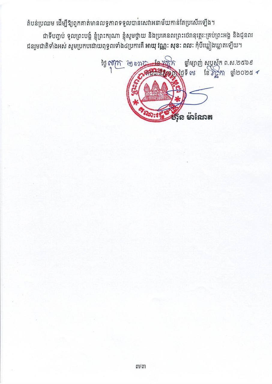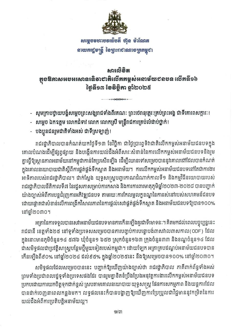 សម្តេចមហាបវរធិបតី ហ៊ុន ម៉ាណែត ចេញសារលិខិតក្នុងឱកាសអបអរសាទរទិវាជាតិលើកកម្ពស់អនាម័យជនបទ លើកទី១៦ ឆ្នាំ២០២៥