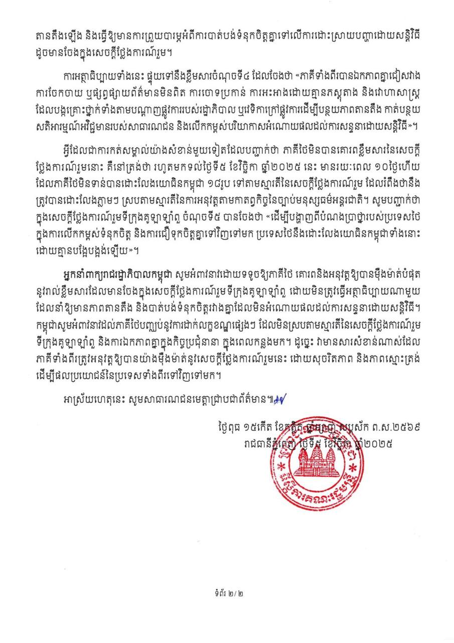 សេចក្តីថ្លែងការណ៍របស់អ្នកនាំពាក្យរាជរដ្ឋាភិបាលកម្ពុជា បញ្ជាក់ពីជំហររបស់កម្ពុជាក្នុងការគោរពយ៉ាងម៉ឺងម៉ាត់សេចក្តីថ្លែងការណ៍រួម ស្តីពីកិច្ចព្រមព្រៀងសន្តិភាពទីក្រុងគូឡាឡាំពួ និងអំពាវនាវអោយភាគីថៃគោរពដូចគ្នាដែរ៕