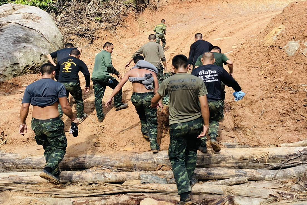 [Thai soldiers carry a comrade who triggered an anti-personnel mine explosion on November 10. Royal Thai Army]