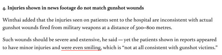 The report, which is currently blocked, like the entire Nation website, to Cambodian visitors – unlike Khmer Times, which is happy to have Thai readers – shows the image presented under a section entitled ‘Injuries shown in news footage do not match gunshot wounds‘ and states that ‘Winthai added that the injuries seen on patients sent to the hospital are inconsistent with actual gunshot wounds fired from military weapons at a distance of 500–800 metres. Such wounds should be severe and extensive, he said — yet the patients shown in reports appeared to have minor injuries and were even smiling, which is “not at all consistent with gunshot victims.”’