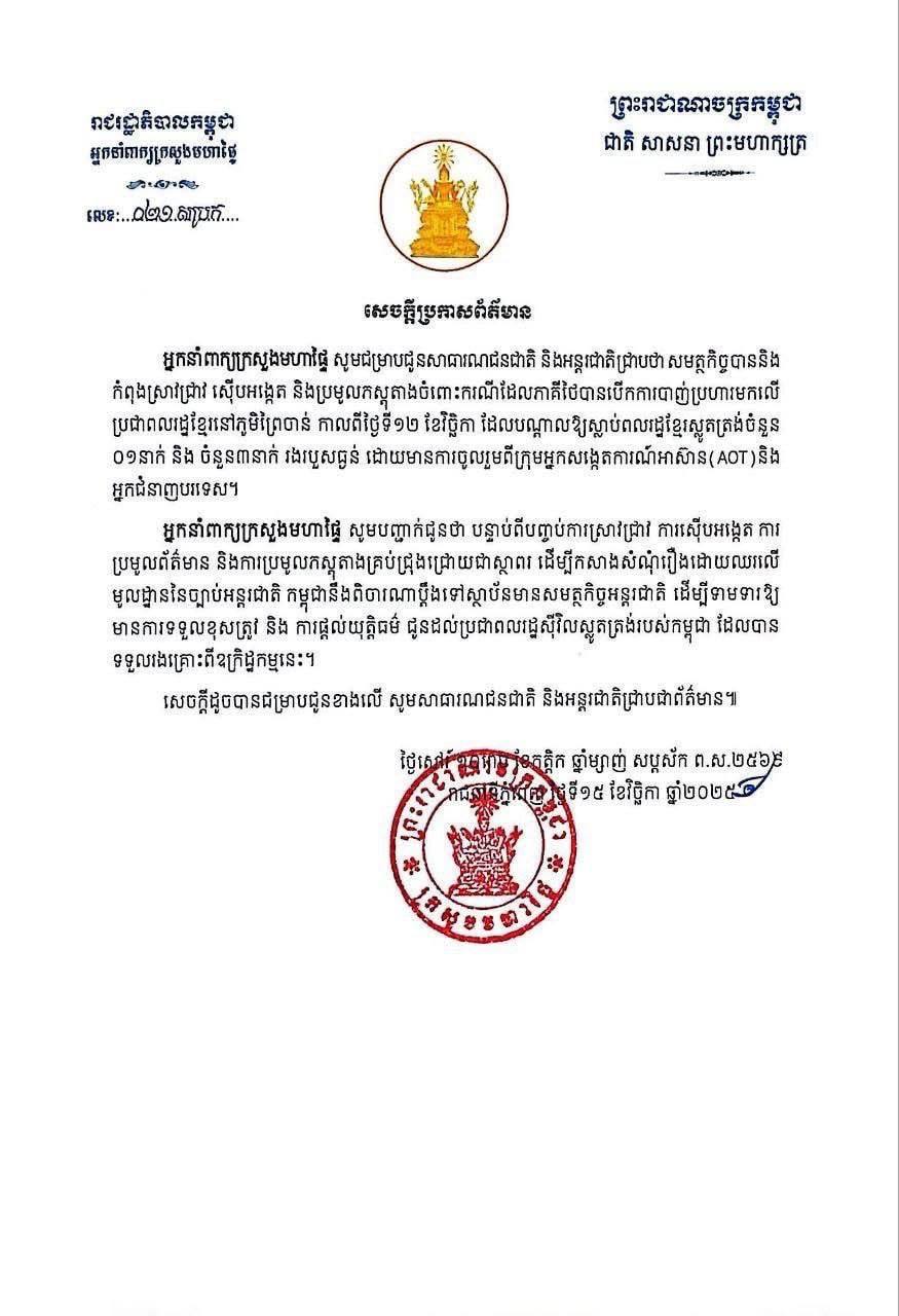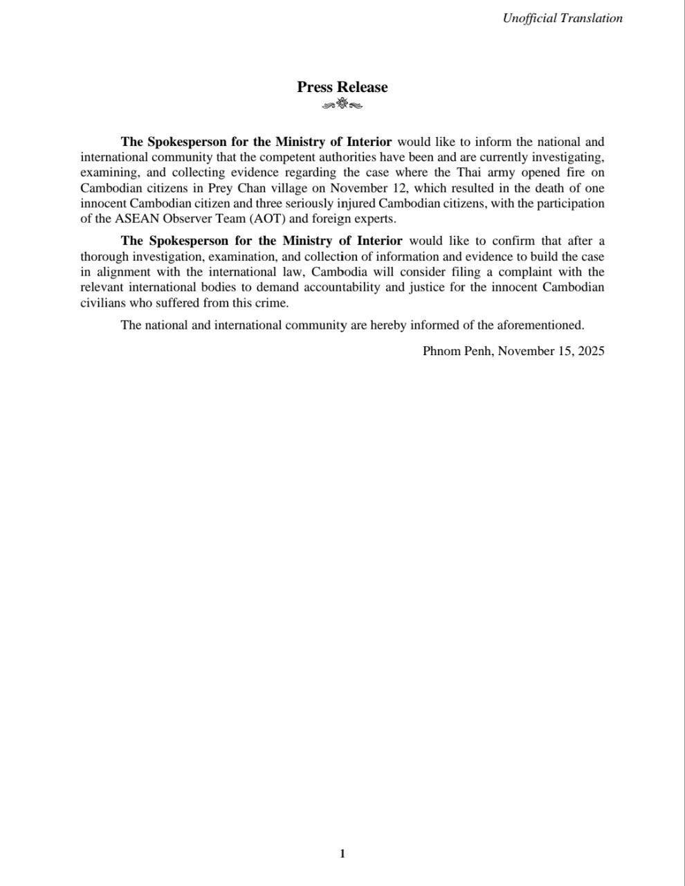 (ភ្នំពេញ)៖ នៅរសៀលថ្ងៃទី១៥ ខែវិច្ឆិកា ឆ្នាំ២០២៥នេះ អ្នកនាំពាក្យក្រសួងមហាផ្ទៃ បានជូនដំណឹងដល់សាធារណជនជាតិ និងអន្តរជាតិជ្រាបថា សមត្ថកិច្ចបាននិងកំពុងស្រាវជ្រាវ ស៊ើបអង្កេត និងប្រមូលភស្តុតាងចំពោះករណីដែលភាគីថៃបានបើកការបាញ់ប្រហារមកលើប្រជាពលរដ្ឋខ្មែរនៅភូមិព្រៃចាន់ កាលពីថ្ងៃទី១២ ខែវិច្ឆិកា ដែលបណ្ដាលឱ្យស្លាប់ពលរដ្ឋខ្មែរស្លូតត្រង់ចំនួន០១នាក់ និង ចំនួន៣នាក់ រងរបួសធ្ងន់ ដោយមានការចូលរួមពីក្រុមអ្នកសង្កេតការណ៍អាស៊ាន (AOT) និងអ្នកជំនាញបរទេស។