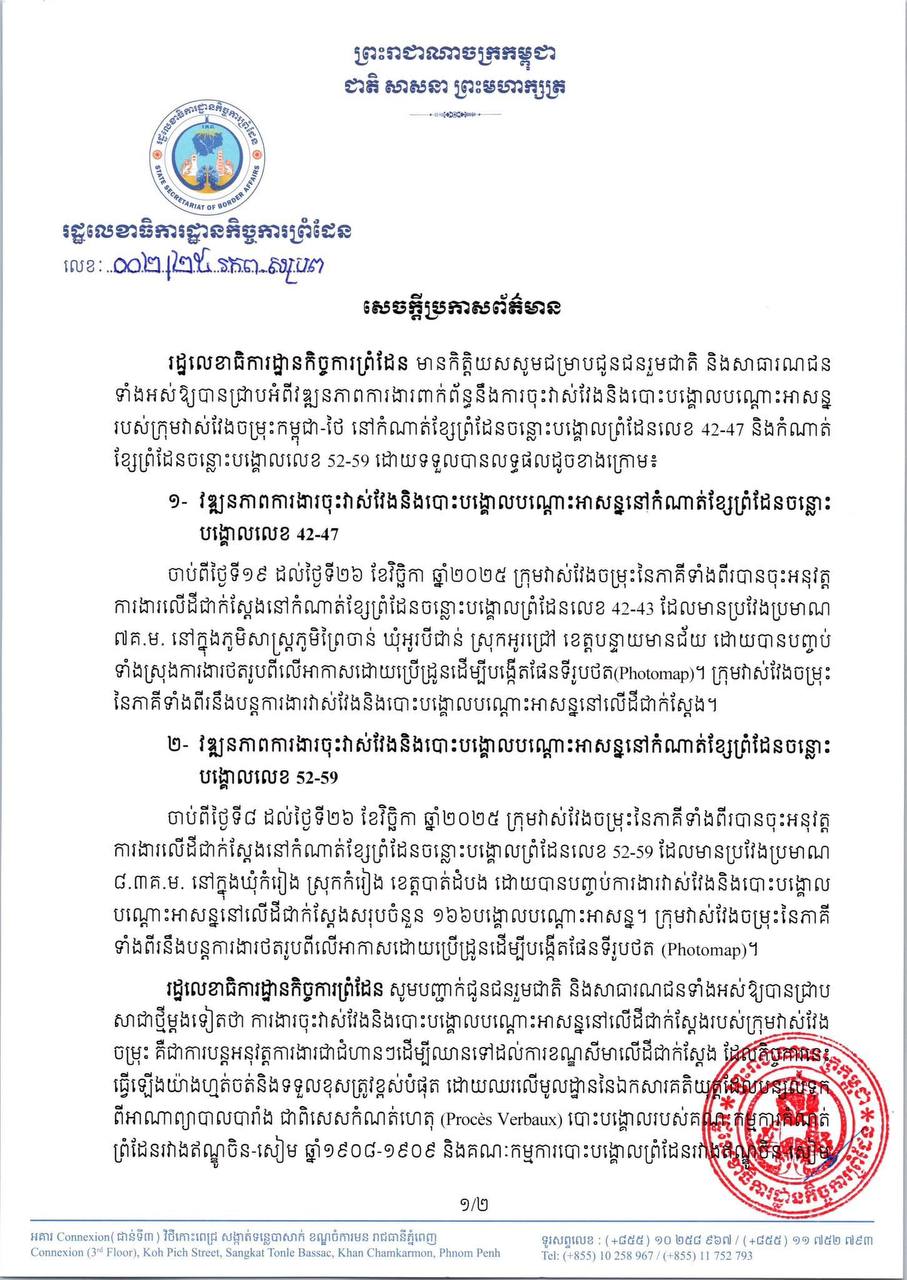 យោងតាមសេចក្តីប្រកាសព័ត៌មានរដ្ឋលេខាធិការដ្ឋានកិច្ចការព្រំដែននៅថ្ងៃទី២៦ ខែវិច្ឆិកា ឆ្នាំ២០២៥បានឲ្យដឹងថា ការងារពាក់ព័ន្ធនឹងការចុះវាស់វែងនិងបោះបង្គោលបណ្តោះអាសន្នរបស់ក្រុមវាស់វែងចម្រុះកម្ពុជា-ថៃនៅកំណាត់ខ្សែព្រំដែនចន្លោះបង្គោលព្រំដែនលេខ 42-47 និងកំណាត់ខ្សែព្រំដែនចន្លោះបង្គោលលេខ 52-59 ដោយទទួលបានលទ្ធផលដូចខាងក្រោម៖