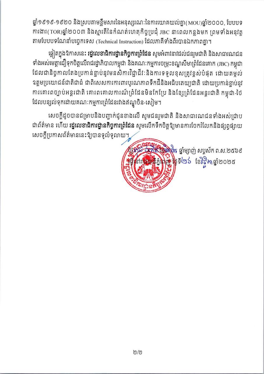 រដ្ឋលេខាធិការដ្ឋានកិច្ចការព្រំដែនបានបញ្ជាក់ជូនជនរួមជាតិ និងសាធារណជនទាំងអស់សាជាថ្មីម្តងទៀតថា ការងារចុះវាស់វែងនិងបោះបង្គោលបណ្តោះអាសន្ននៅលើដីជាក់ស្តែងរបស់ក្រុមវាស់វែងចម្រុះ គឺជាការបន្តអនុវត្តការងារជាជំហានៗដើម្បីឈានទៅដល់ការខណ្ឌសីមាលើដី ធ្វើឡើងយ៉ាងហ្មត់ចត់និងទទួលខុសត្រូវខ្ពស់បំផុត ដោយឈរលើមូលដ្ឋាននៃឯកសារគតិយុត្តដែលមានបន្សល់ទុកពីអាណាព្យាបាលបារាំង ជាពិសេសកំណត់ហេតុ (Procès Verbaux) បោះបង្គោលរបស់គណៈកម្មការកំណត់ព្រំដែនរវាងឥណ្ឌូចិន-សៀម ឆ្នាំ១៩០៨-១៩០៩ និងគណៈកម្មការបោះបង្គោលព្រំដែនរវាងឥណ្ឌូចិន-សៀម ឆ្នាំ១៩១៩-១៩២០ និងស្របតាមខ្លឹមសារនៃអនុស្សរណៈនៃការយោគយល់គ្នា (MOU)ឆ្នាំ២០០០, បែបបទការងារ (TOR)ឆ្នាំ២០០៣ និងស្មារតីនៃកំណត់ហេតុកិច្ចប្រជុំ JBC នាពេលកន្លងមក ព្រមទាំងអនុវត្តតាមបែបបទណែនាំបច្ចេកទេស (Technical Instruction) ដែលភាគីទាំងពីរបានឯកភាពគ្នា។