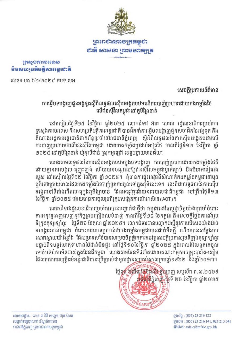 យោងតាមសេចក្តីប្រកាសព័ត៌មានរបស់ក្រសួងការបរទេសនិងសហប្រតិបត្តិការអន្តរជាតិនៅថ្ងៃទី២៦ ខែវិច្ឆិកា ឆ្នាំ២០២៥ បានឱ្យដឹងថា លោកជំទាវ អ៊ាត សោភា រដ្ឋលេខាធិការប្រចាំការក្រសួងការបរទេស និងសហប្រតិបត្តិការអន្តរជាតិ បានដឹកនាំការធ្វើបទបង្ហាញជូនសមាជិកនៃអង្គទូត និងតំណាងអង្គការអន្តរជាតិពាក់ព័ន្ធប្រចាំនៅរាជធានីភ្នំពេញស្តីអំពីលទ្ធផលនៃការស៊ើបអង្កេតបឋមលើការបាញ់ប្រហារមកលើជនស៊ីវិលកម្ពុជា ដោយកងកម្លាំងប្រដាប់អាវុធថៃ កាលពីថ្ងៃទី១២ ខែវិច្ឆិកា ឆ្នាំ២០២៥ នៅភូមិព្រៃចាន់ ឃុំអូរបីជាន់ ស្រុកអូរជ្រៅ ខេត្តបន្ទាយមានជ័យ។