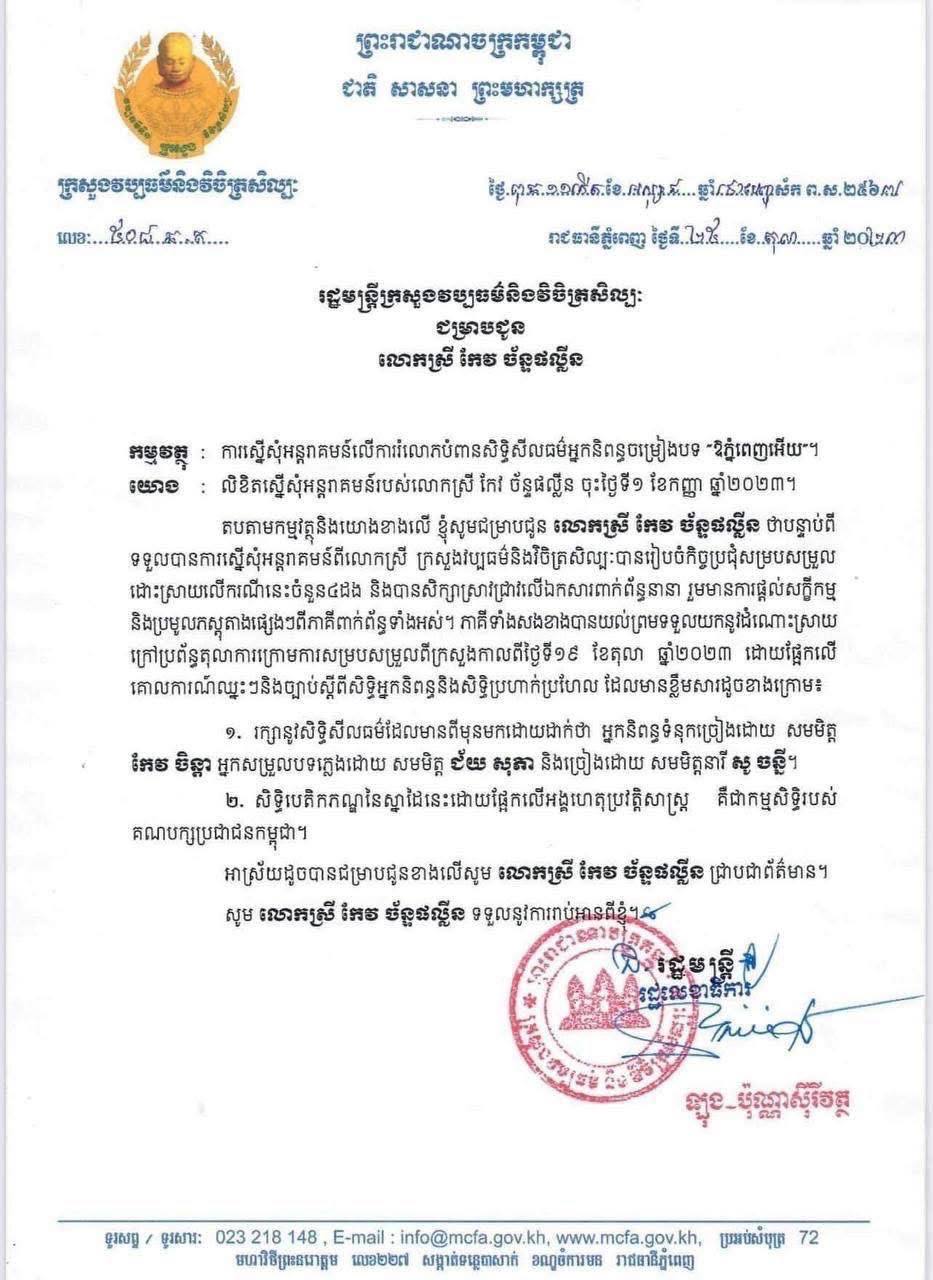 ខ្ញុំសូមនិយាយទៅកាន់កូន ឬចៅលោក ម៉ម ធឿន វិញម្តង។ ប្រហែលអ្នកផ្សាយព័ត៌មានខុសដោយអចេតនា ដែលថា លោក ម៉ម ធឿន ជាម្ចាស់បទចម្រៀង(ឱ ភ្នំពេញអើយ) ខ្ញុំជាអ្នកគ្រប់គ្រងលើឪពុករបស់ក្មួយៗ និងចៅៗ យើងជាយោធាមិនអាចយកចម្រៀងទៅថតនៅអង្គភាពស៊ីវិលបានទេ បើគ្មានការ