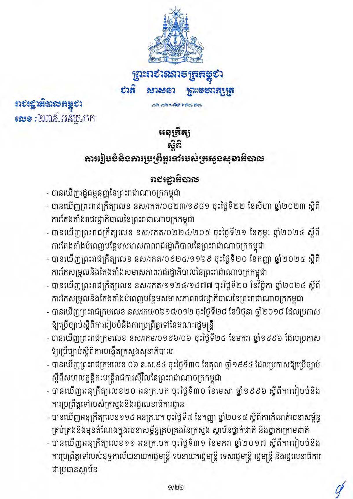 អនុក្រឹត្យ ស្តីពី ការរៀបចំនិងការប្រព្រឹត្តទៅរបស់ក្រសួងសុខាភិបាល