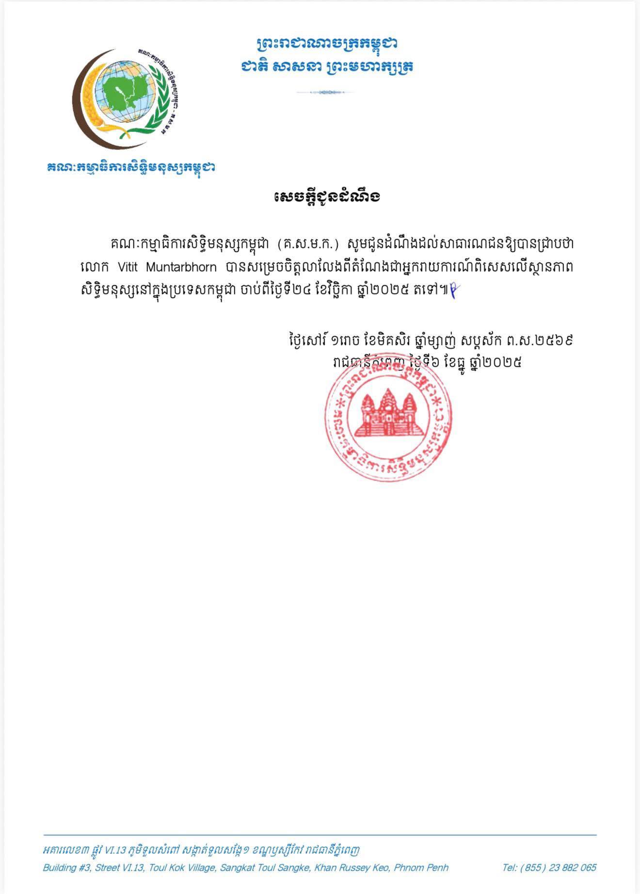 ឯកឧត្តម ទេសរដ្ឋមន្ត្រី កែវ រ៉េមី៖ លោក វីទីត ម៉ុនតាប៊ន អ្នករាយការណ៍ពិសេសស្តីពីសិទ្ធិមនុស្សនៅកម្ពុជាបានធ្វើលិខិតលាលែងពីមុខតំណែងហើយ
