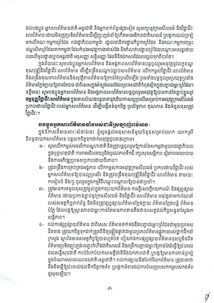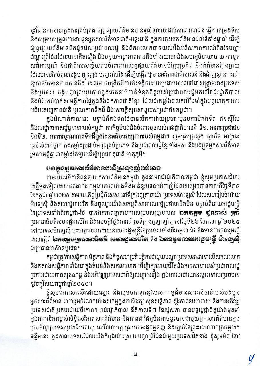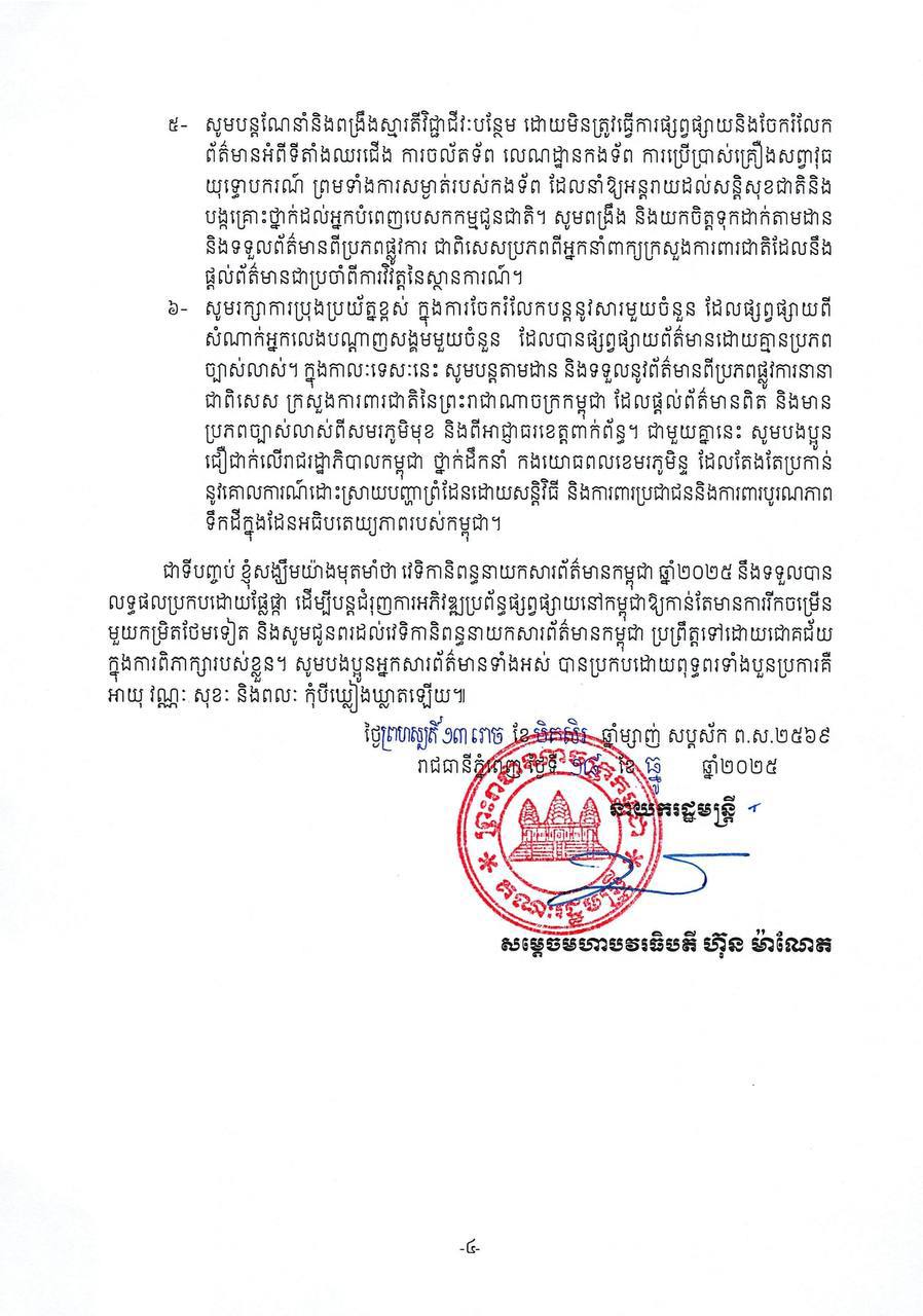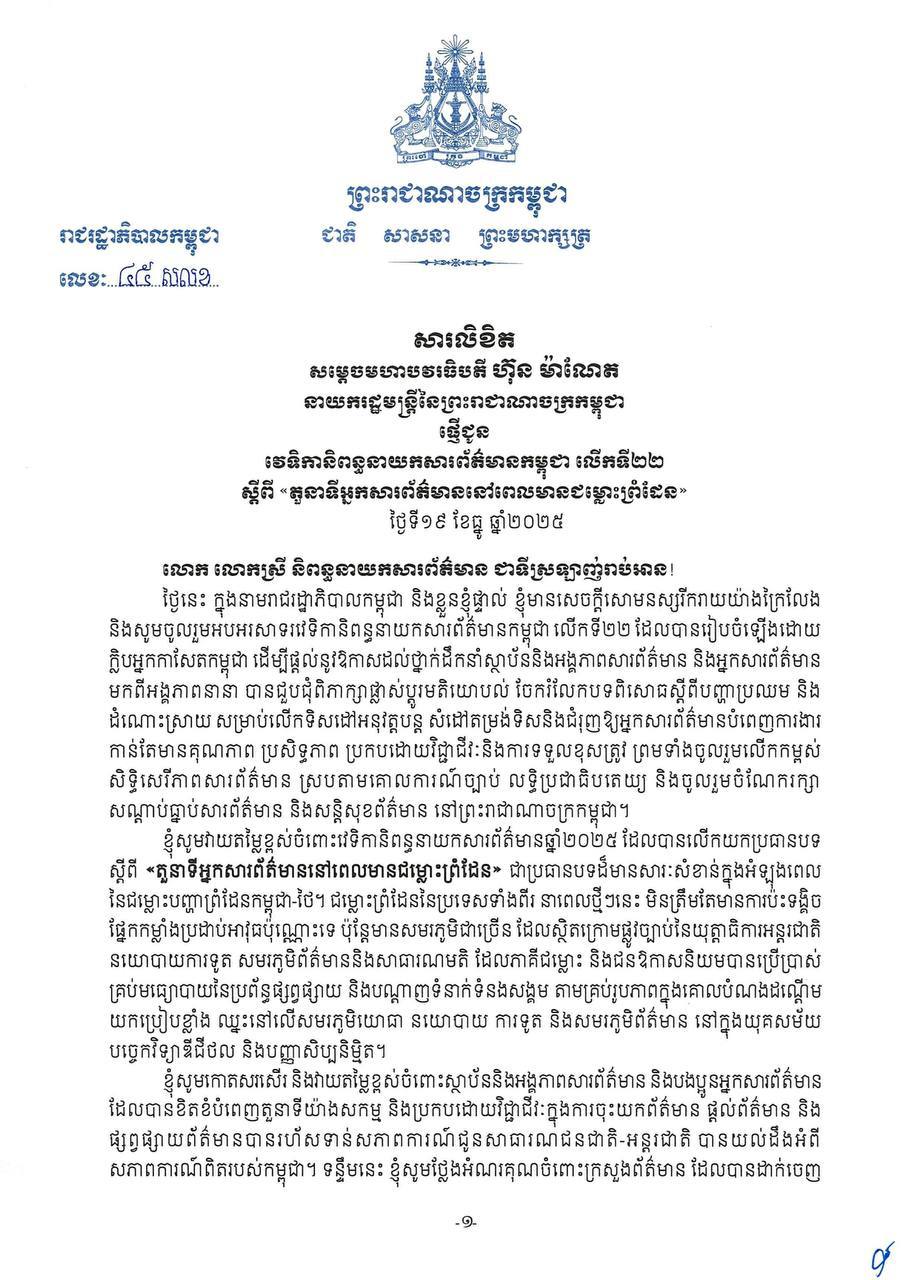 សារលិខិត សម្តេចមហាបវរធិបតី ហ៊ុន ម៉ាណែត ផ្ញើជូន វេទិកានិពន្ធនាយកសារព័ត៌មានកម្ពុជា លើកទី២២ ស្តីពី “តួនាទីអ្នកសារព័ត៌មាននៅពេលមានជម្លោះព្រំដែន”