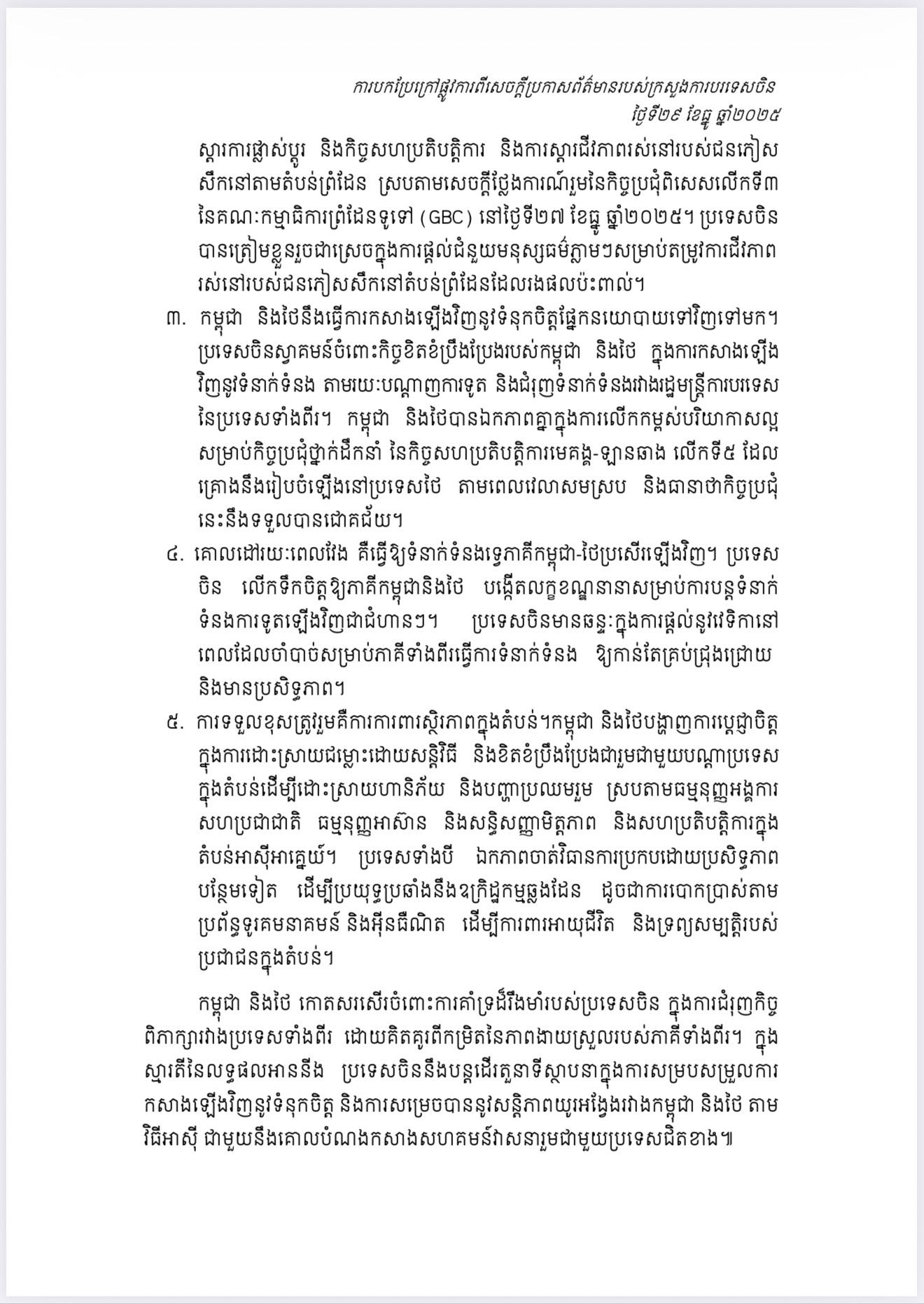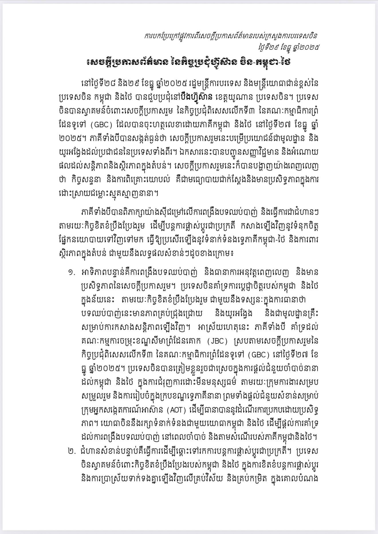 សេចក្តីប្រកាសព័ត៌មាន ស្តីពីកិច្ចប្រជុំហ្វ៊ូស៊ាន ចិន-កម្ពុជា-ថៃ