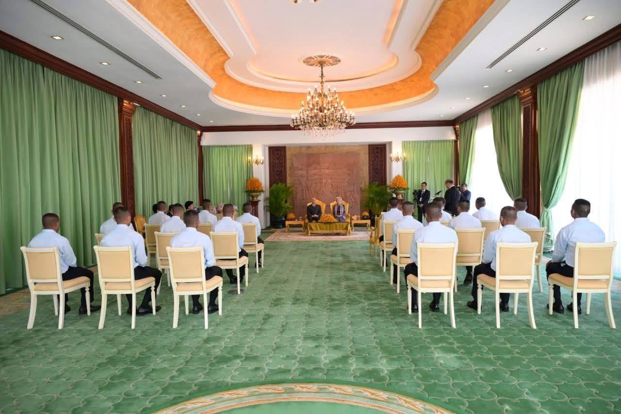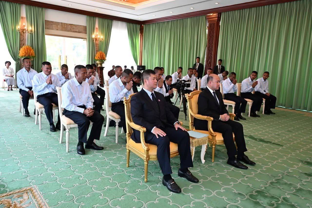(ភ្នំពេញ)៖ ព្រះករុណាជាអម្ចាស់ជីវិតលើត្បូង ព្រះបាទសម្តេចព្រះបរមនាថ ព្រះមហាក្សត្រនៃព្រះរាជាណាចក្រកម្ពុជា ជាទីគោរពសក្ការៈដ៏ខ្ពង់ខ្ពស់បំផុត និងសម្តេចព្រះមហាក្សត្រី ព្រះវររាជមាតាជាតិខ្មែរ ជាទីគោរពសក្ការៈដ៏ខ្ពង់ខ្ពស់បំផុត ព្រះអង្គសព្វព្រះរាជហឬទ័យប្រោសព្រះរាជទានឯកឧត្តម ហ៊ុន ម៉ានី ឧបនាយករដ្ឋមន្ត្រី រដ្ឋមន្ត្រីក្រសួងមុខងារសាធារណៈ និងឯកឧត្តមឧត្តមសេនីយ៍ឯក ហ៊ុន ម៉ានិត មេបញ្ជាការរងកងទ័ពជើងគោក ដឹកនាំវីរកងទ័ពទាំង១៨រូប ដែលបាននិវត្តន៍មកកាន់មាតុប្រទេសវិញ ប្រកបដោយសុខសុវត្ថិភាពខ្ពស់ ក្រោយពីស្ថិតក្នុងការឃុំគ្រងរបស់ភាគីថៃអស់រយៈពេល ១៥៥ថ្ងៃ ចូលក្រាបថ្វាយបង្គំគាល់ នៅព្រះបរមរាជវាំង វេលាព្រឹក ថ្ងៃទី០១ ខែមករា ឆ្នាំ២០២៦។