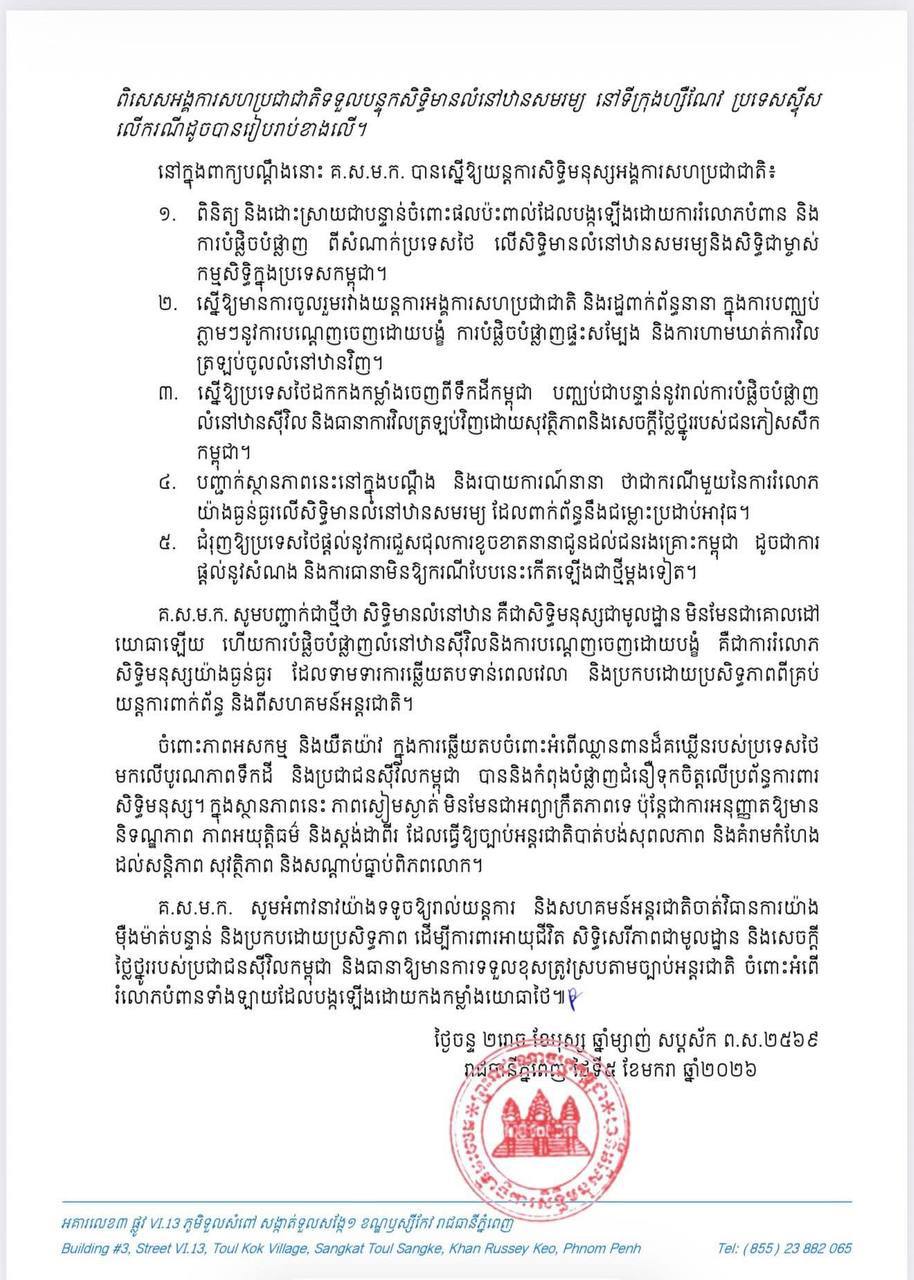 គណៈកម្មាធិការសិទ្ធិមនុស្សកម្ពុជា (គ.ស.ម.ក.) ដាក់ពាក្យបណ្តឹង ទៅកាន់យន្តការសិទ្ធិមនុស្សនៃអង្គការសហប្រជាជាតិ ទាមទារឱ្យចាត់វិធានការយ៉ាងឆាប់រហ័ស និងម៉ឺងម៉ាត់ ចំពោះការរំលោភសិទ្ធិមានលំនៅឋាន និងសិទ្ធិកាន់កាប់ទ្រព្យសម្បត្តិឯកជនរបស់ប្រជាពលរដ្ឋកម្ពុជា ដែលបង្កឡើងដោយអំពើឈ្លានពាន ការបំផ្លិចបំផ្លាញផ្ទះសម្បែង ការលួចយកទ្រព្យសម្បត្តិ និងការបណ្តេញចេញដោយបង្ខំពីកងកម្លាំងយោធាថៃ។