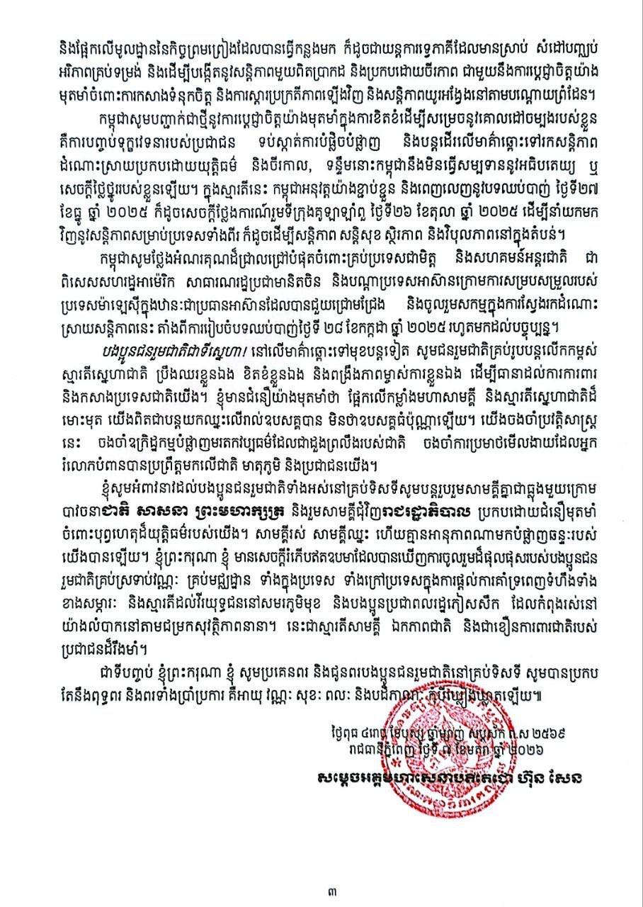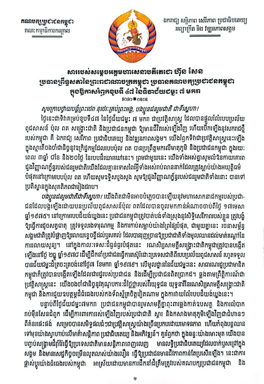 សាររបស់សម្តេចអគ្គមហាសេនាបតីតេជោ ហ៊ុន សែន ប្រធានព្រឹទ្ធសភា នៃព្រះរាជាណាចក្រកម្ពុជា ប្រធានគណបក្សប្រជាជនកម្ពុជា ក្នុងឱកាសរំឭកខួបទី៤៧ នៃទិវាជ័យជម្នះ ៧មករា