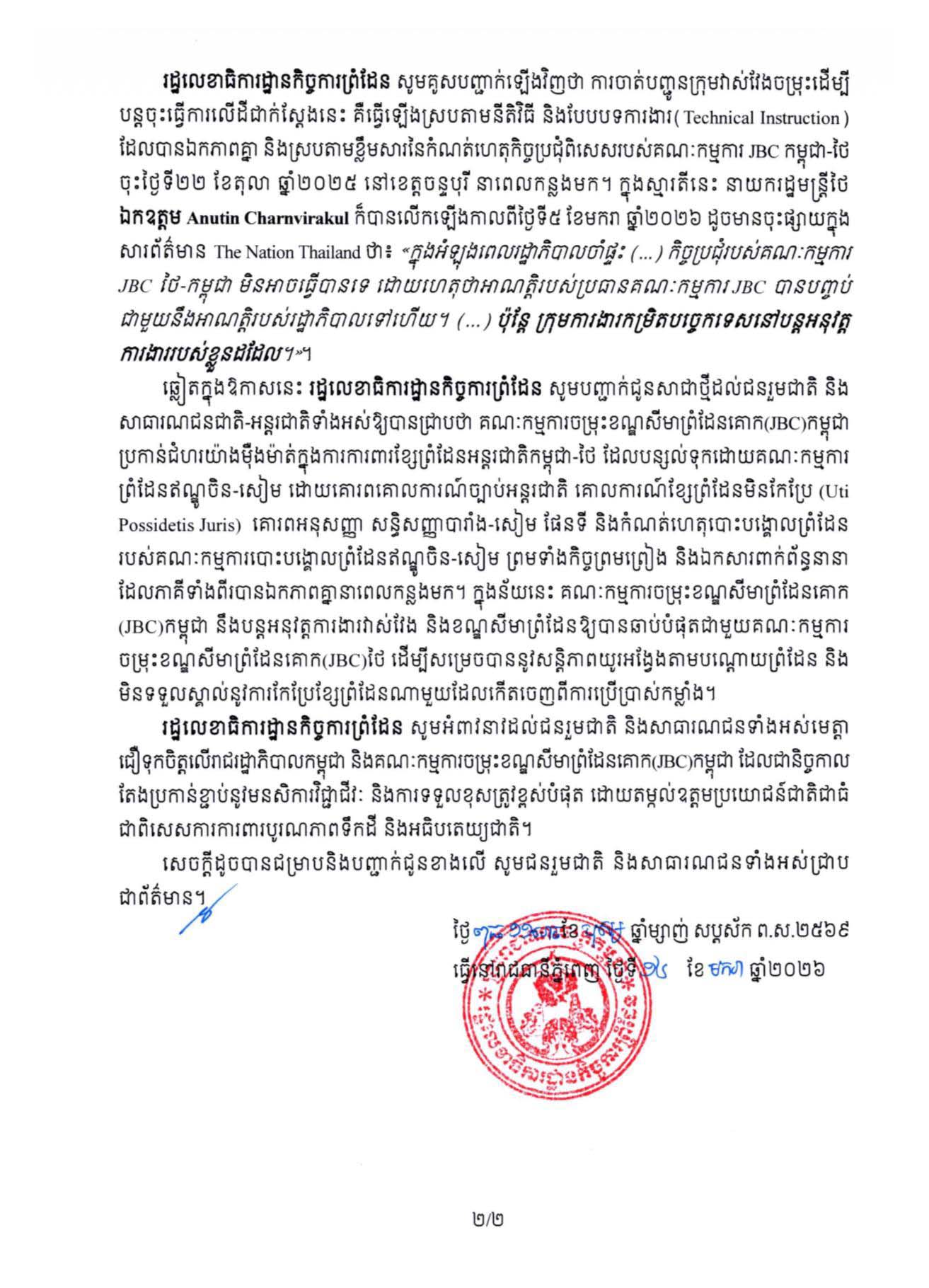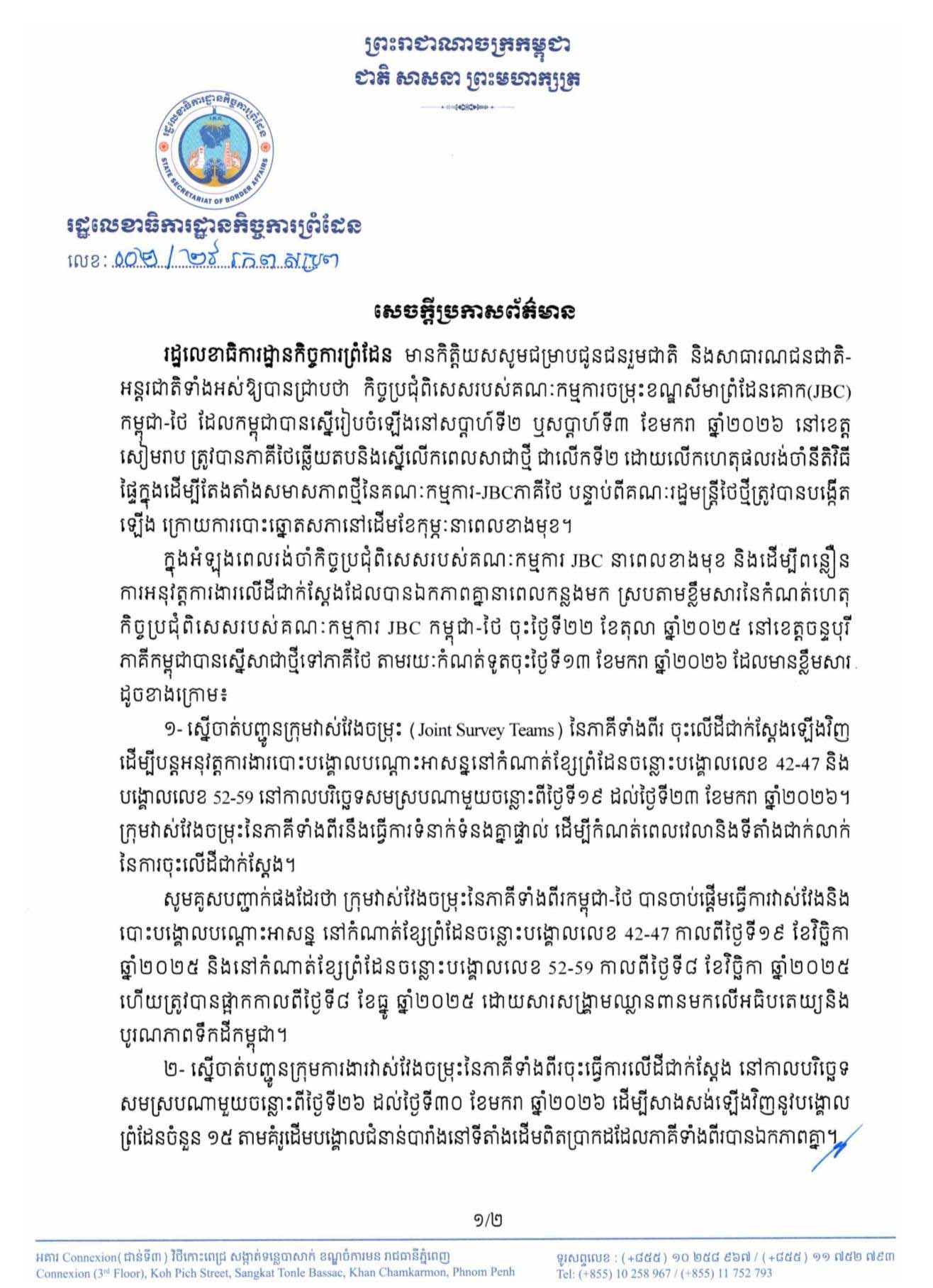 រដ្ឋលេខាធិការដ្ឋានកិច្ចការព្រំដែន | កិច្ចប្រជុំពិសេសរបស់គណៈកម្មការចម្រុះខណ្ឌសីមាព្រំដែនគោក(JBC) កម្ពុជា-ថៃ ដែលកម្ពុជាបានស្នើរៀបចំឡើងនៅសប្តាហ៍ទី២ ឬសប្តាហ៍ទី៣ ខែមករា ឆ្នាំ២០២៦ នៅខេត្ត សៀមរាប ត្រូវបានភាគីថៃឆ្លើយតប និងស្នើលើកពេលសាជាថ្មី ជាលើកទី២ ដោយលើកហេតុផលរង់ចាំនីតិវិធីផ្ទៃក្នុងដើម្បីតែងតាំងសមាសភាពថ្មីនៃគណៈកម្មការ-JBCភាគីថៃ