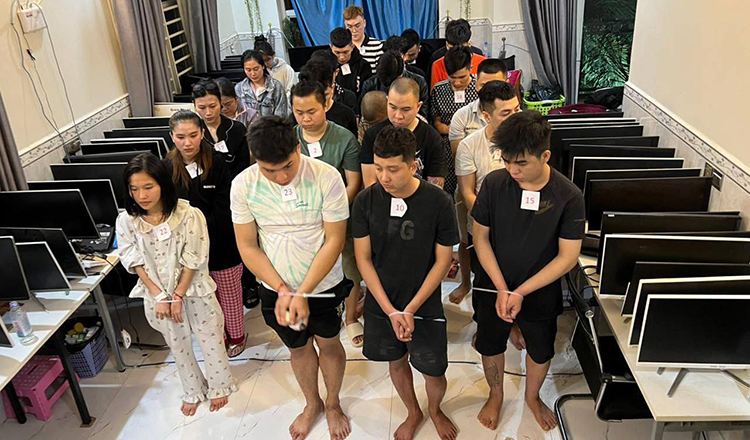 Suspects arrested by police during a raid on an online scam operation in Preah Sihanouk province in July last year. National Police