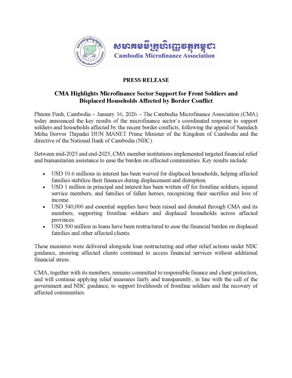 ភ្នំពេញ, ថ្ងៃទី១៦ ខែមករា ឆ្នាំ២០២៦៖ សមាគមមីក្រូហិរញ្ញវត្ថុកម្ពុជា (CMA) នៅថ្ងៃនេះបង្ហាញលទ្ធផលសំខាន់ៗនៃកិច្ចសហប្រតិបត្តិការក្នុងវិស័យមីក្រូហិរញ្ញវត្ថុ ដើម្បីគាំទ្រដល់កងទ័ព និងប្រជាពលរដ្ឋដែលរងផលប៉ះពាល់ដោយសារជម្លោះព្រំដែននាពេលថ្មីៗនេះ ដែលឆ្លើយតបទៅនឹងការអំពាវនាវរបស់ សម្តេចមហាបវរធិបតី ហ៊ុន ម៉ាណែត នាយករដ្ឋមន្រ្តីនៃព្រះរាជាណាចក្រកម្ពុជា និងតាមសេចក្តីណែនាំរបស់ធនាគារជាតិនៃកម្ពុជា (NBC)។