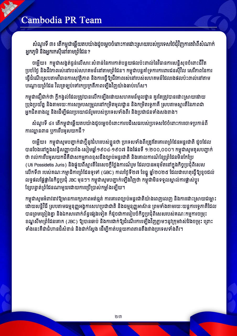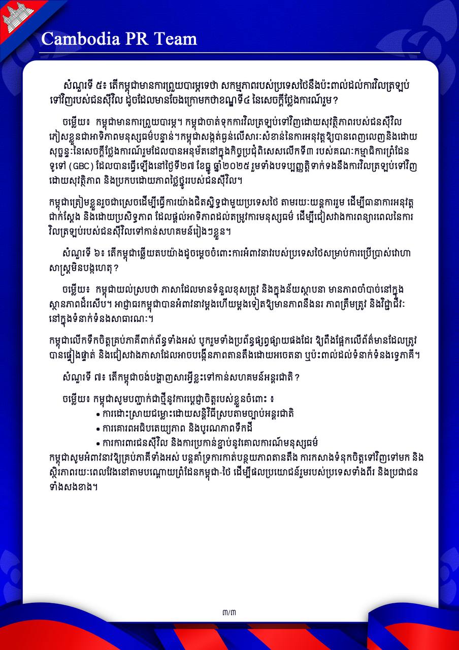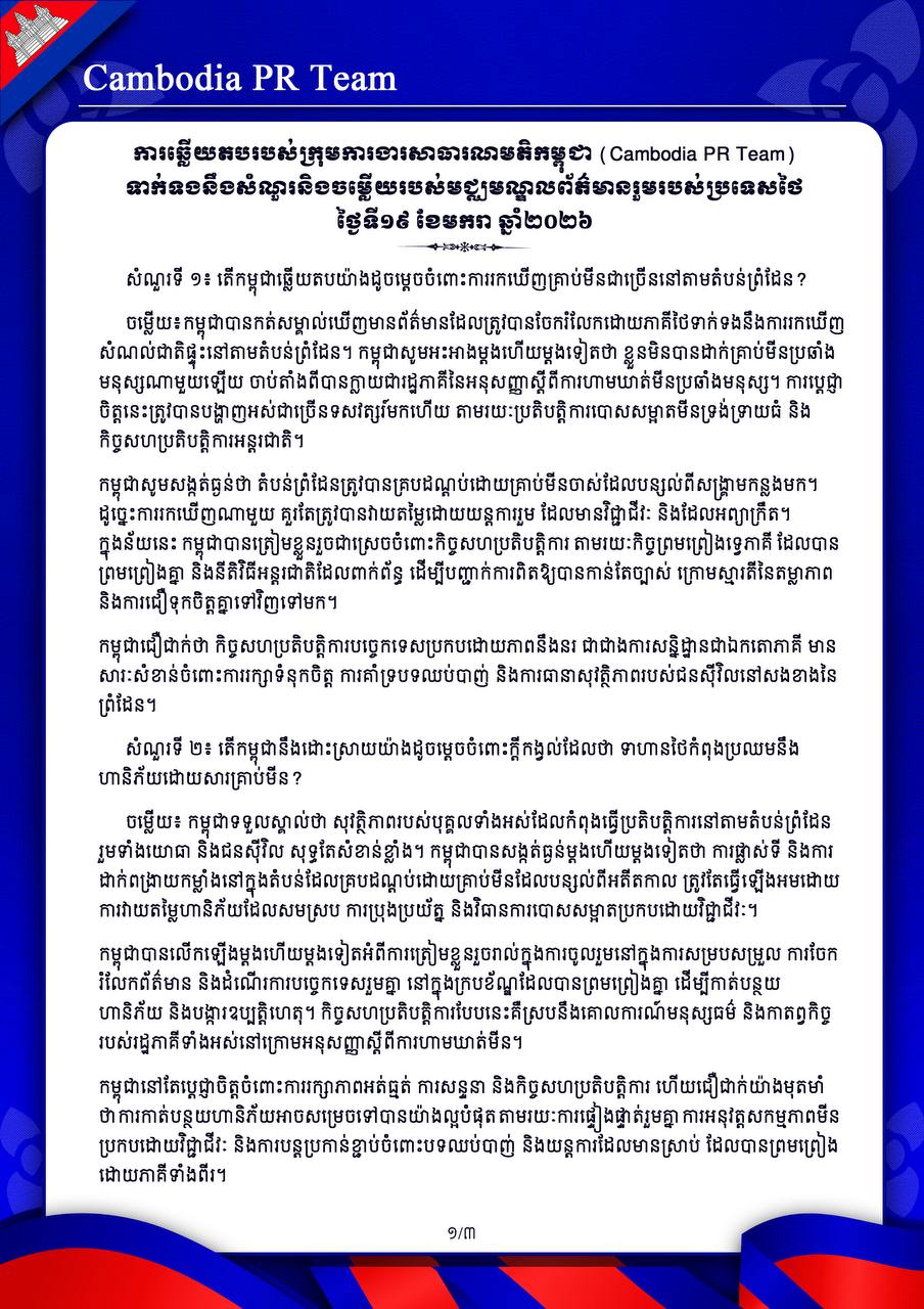 ការឆ្លើយតបរបស់ ក្រុមការងារសាធារណមតិកម្ពុជា (Cambodia PR Team)ទាក់ទងនឹងសំណួរនិងចម្លើយរបស់មជ្ឈមណ្ឌលព័ត៌មានរួមរបស់ប្រទេសថៃ ថ្ងៃទី១៩ ខែមករា ឆ្នាំ២០២៦