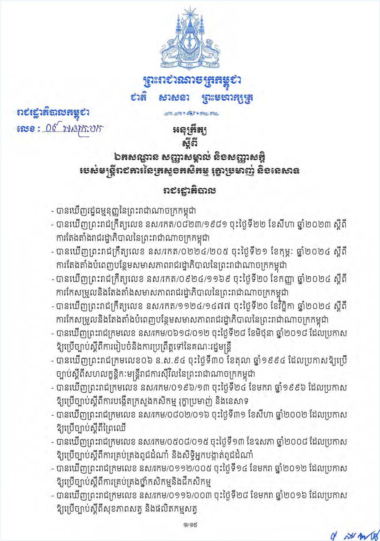 (ភ្នំពេញ)៖ សម្តេចបវរធិបតី ហ៊ុន ម៉ាណែត នាយករដ្ឋមន្ត្រីនៃកម្ពុជា បានចេញអនុក្រឹត្យ ស្តីពី ឯកសណ្ឋាន សញ្ញាសម្គាល់ និងសញ្ញាសក្តិ របស់មន្ត្រីរាជការនៃក្រសួងកសិកម្ម រុក្ខាប្រមាញ់ និងនេសាទ។