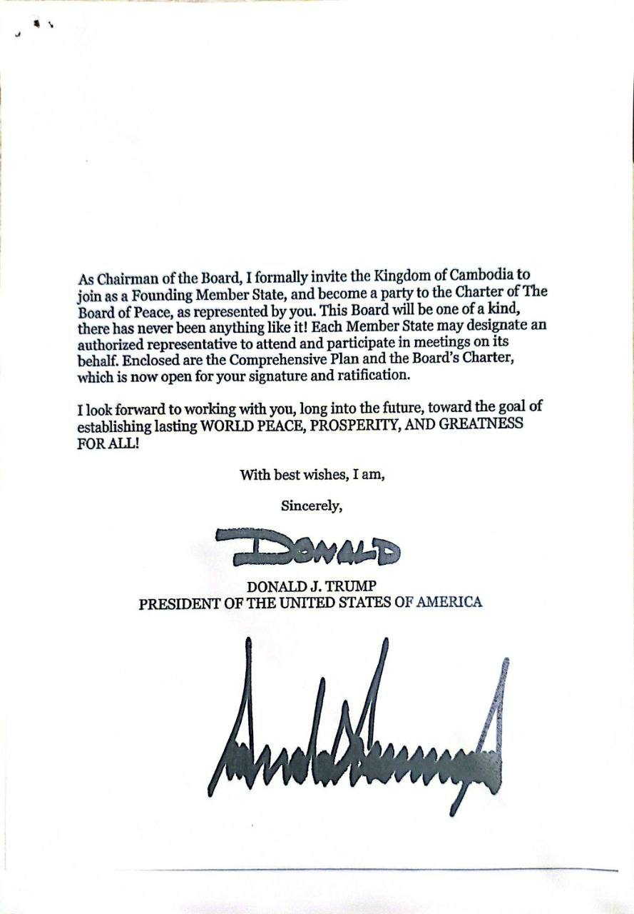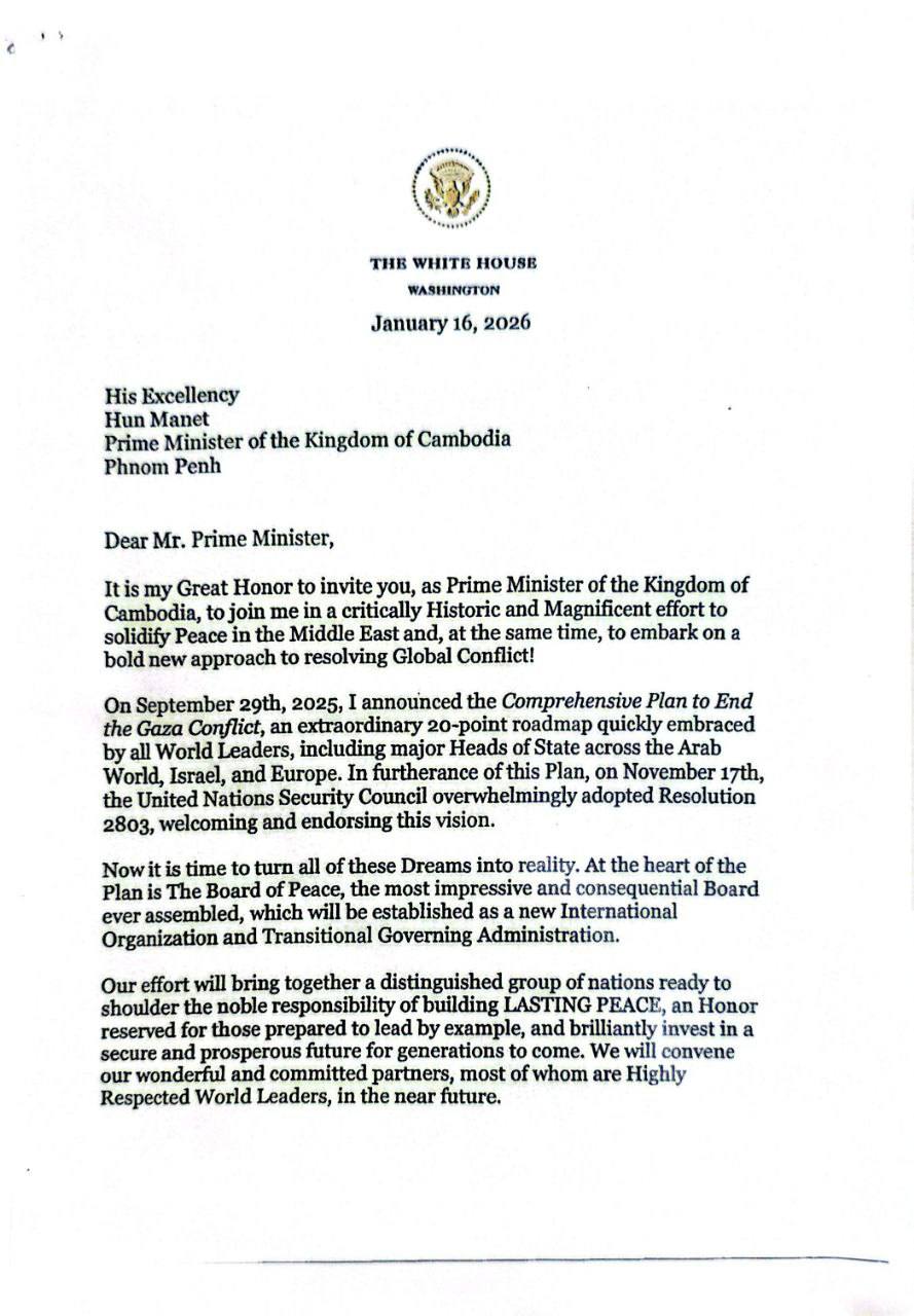 ឯកឧត្តម ប៉ែន បូណា អ្នកនាំពាក្យរាជរដ្ឋាភិបាលកម្ពុជា បានថ្លែងថា សម្តេចធិបតី ហ៊ុន ម៉ាណែត នាយករដ្ឋមន្ត្រីកម្ពុជាបានទទួលការអញ្ជើញជាផ្លូវការពីឯកឧត្តម ដូណាល់ ត្រាំ ប្រធានាធិបតីសហរដ្ឋអាម៉េរិកឱ្យកម្ពុជាចូលជារដ្ឋសមាជិកស្ថាបនិកនិងជាភាគីនៃធម្មនុញ្ញរបស់ក្រុមប្រឹក្សាសន្តិភាព នេះគឺជាកតិត្តិយសសម្រាប់ឯកឧត្តមក្នុងការអញ្ជើញសម្តេចធិបតី ក្នុងនាមជានាយករដ្ឋមន្ត្រីកម្ពុជាចូលរួមក្នុងកិច្ចខិតខំប្រឹងប្រែងដ៏អស្ចារ្យនិងជាប្រត្តិសាស្ត្រ ដើម្បីសន្តិភាព។ ឯកឧត្តម ប៉ែន បូណា បានថ្លែងដូចនេះ នៅថ្ងៃទី ២២ ខែមករា ឆ្នាំ២០២៦ នៅក្នុងឱកាសនៅក្នុងកម្មវិធីផ្សាយផ្ទាល់ពិសេស « ស្ដីពីការវិវត្តន៍ស្ថានការណ៍ព្រំដែនកម្ពុជា-ថៃ នៅទីស្តីការគណៈរដ្ឋមន្ត្រី។