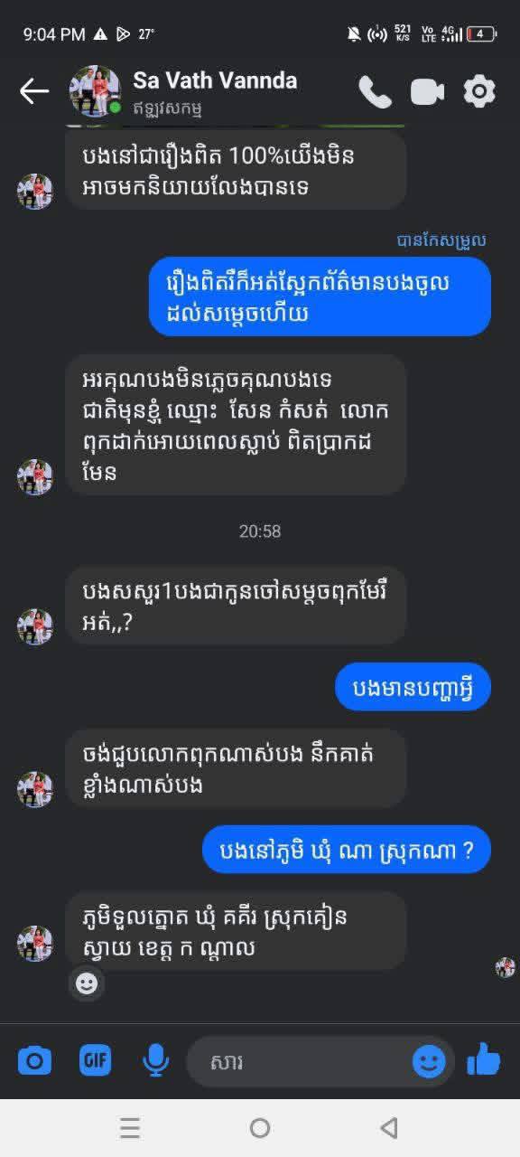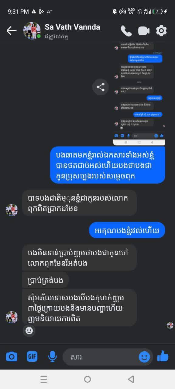 មនុស្សទាំងនោះខ្លះសរសេរជាសំបុត្របញ្ជូនឱ្យខ្ញុំ ខ្លះចុះតាមទស្សនាវដ្តី និងចុងក្រោយបង្ហោះតាមបណ្តាញសង្គមដូចជា Facebook ជាដើម។ ករណីចុងក្រោយហាក់ដូចធ្ងន់បន្តិច មានទាំងអត្ថបទមានទាំងសារឆ្លើយឆ្លងជាមួយមនុស្សដែលស្គាល់ telegram របស់ខ្ញុំ។ ខ្ញុំសូមអំពាវនាវដល់អ្នកភូតកុហក ឈប់ប្រើការឈឺចាប់របស់ខ្ញុំ ដើម្បីផលប្រយោជន៍ផ្ទាល់ខ្លួនតទៅទៀតទៅ»៕