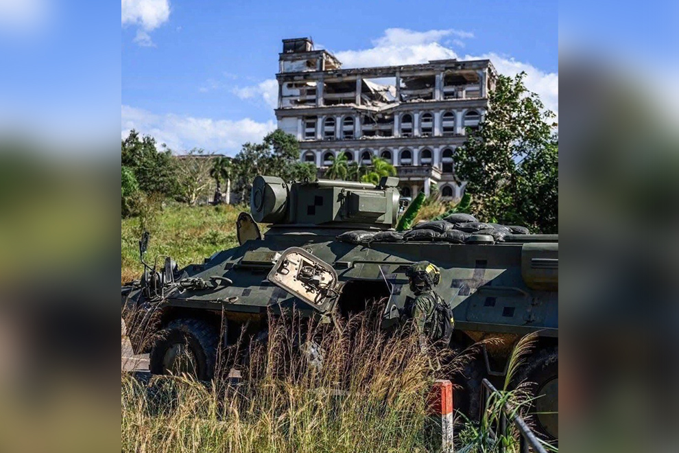 A Thai armoured vehicle near buildings that were destroyed by Thai artillery strikes in the Thma Da area of Pursat Province in December. FB
