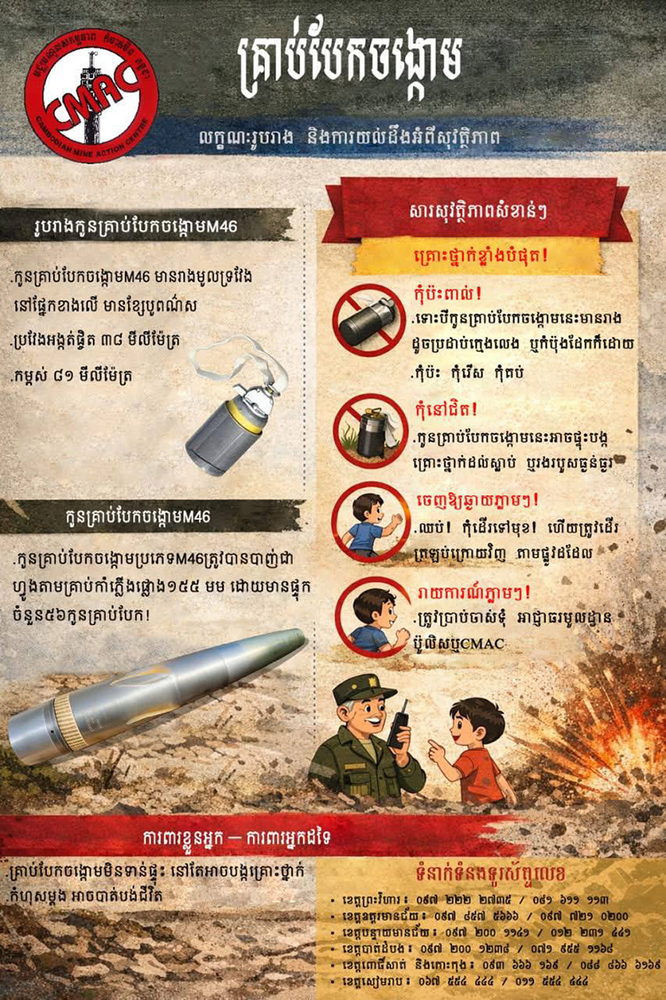 The Cambodian Mine Action Centre (CMAC) has issued an urgent warning calling on residents living in provinces along the Cambodian–Thai border to exercise extreme caution regarding M46 cluster bomb submunitions, used by the Thai military on Cambodian territory.