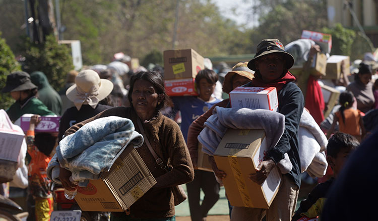 Photo: Thousands of displaced families receive Chinese aid at a ceremony at Bat Thkav Pagoda Refugee Centre in Chong Kal commune, Oddar Meanchey province’s Chong Kal district, earlier this month. KT/Chor Sokunthea