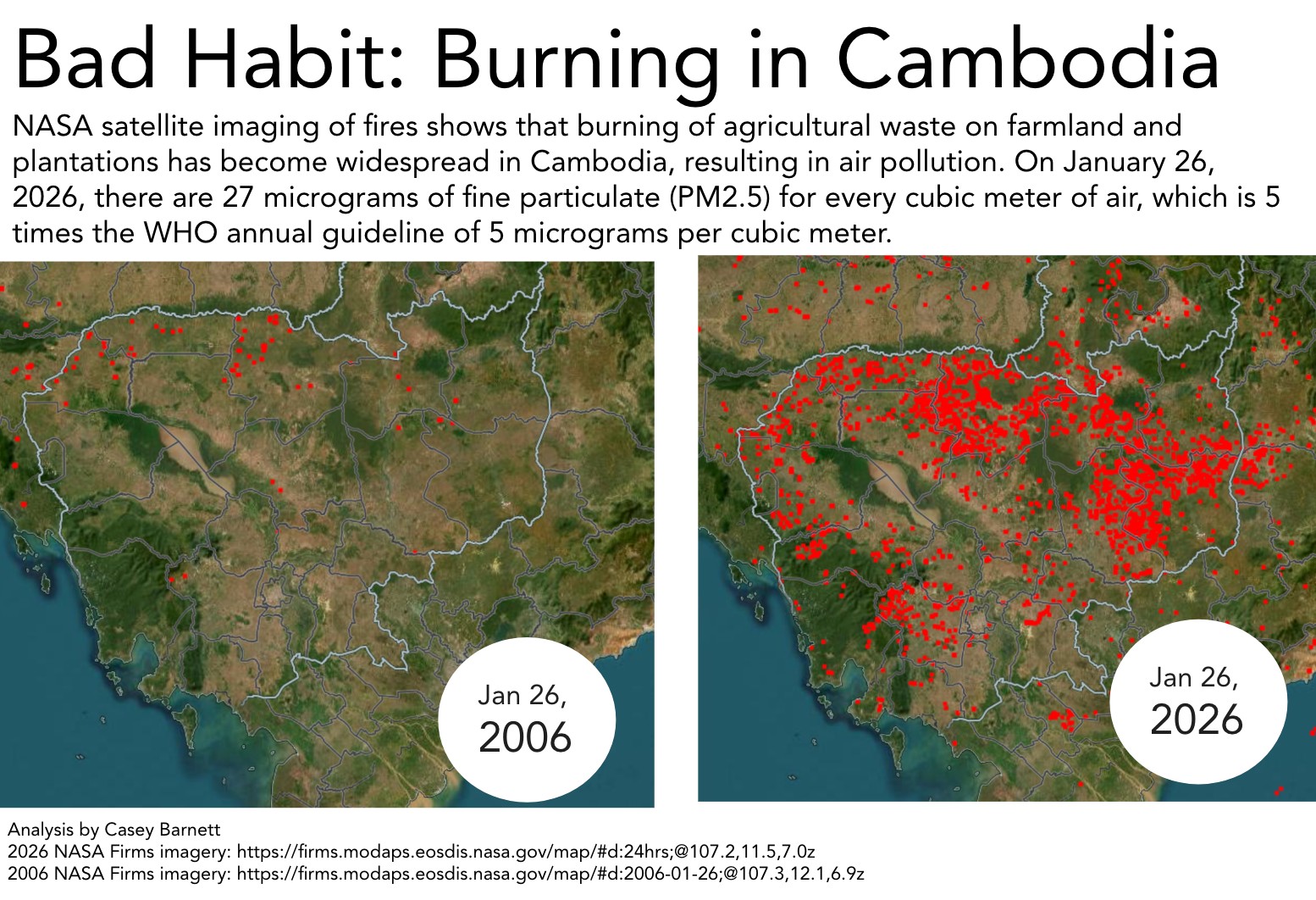 Speaking via his personal social media, Mr Barnett stated that ‘NASA satellite imaging of fires shows that burning of agricultural waste on farmland and plantations has become widespread in Cambodia, resulting in air pollution.