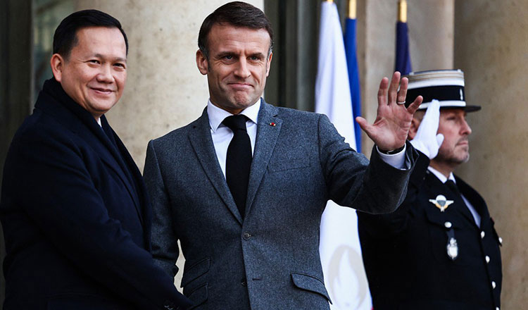 Image: French President Emmanuel Macron (R) greets Prime Minister Hun Manet in a meeting at the Palais de l’Élysée Palais in Paris. Palais de l’Élysée