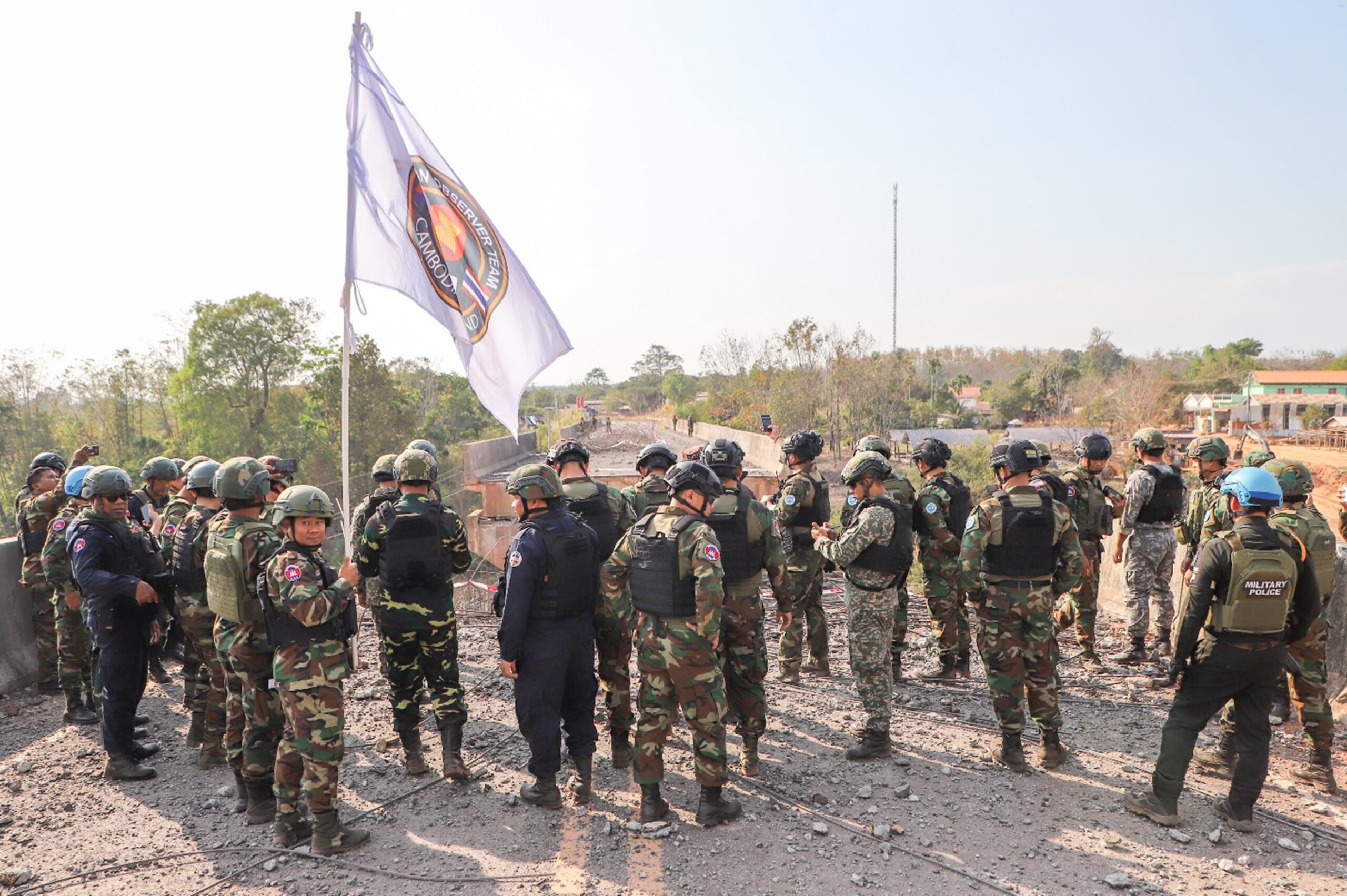 Is Thailand banning AOT from monitoring the ceasefire? The ASEAM Observer’s Team (AOT) in Cambodia recently visited the Mer Teuk bridge, which was damaged by Thai F-16s in December. Supplied