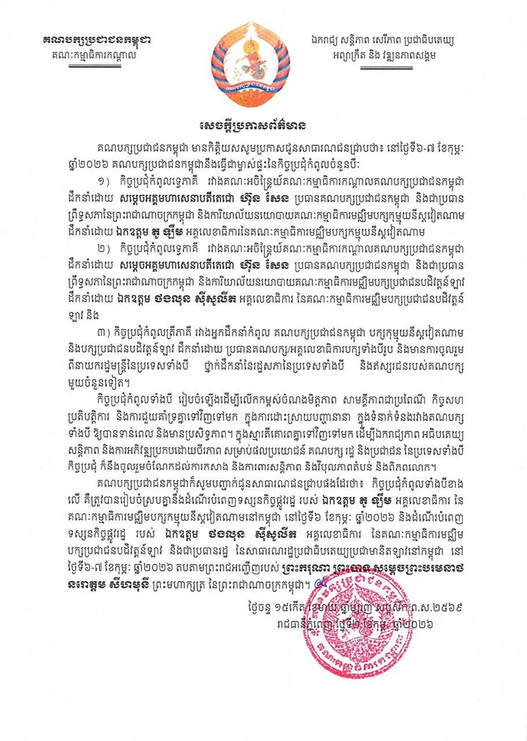 The CPP further clarified that the meetings will coincide with the official state visits to Cambodia by To Lam on February 6, 2026, and by Thongloun Sisoulith on February 6–7, 2026.