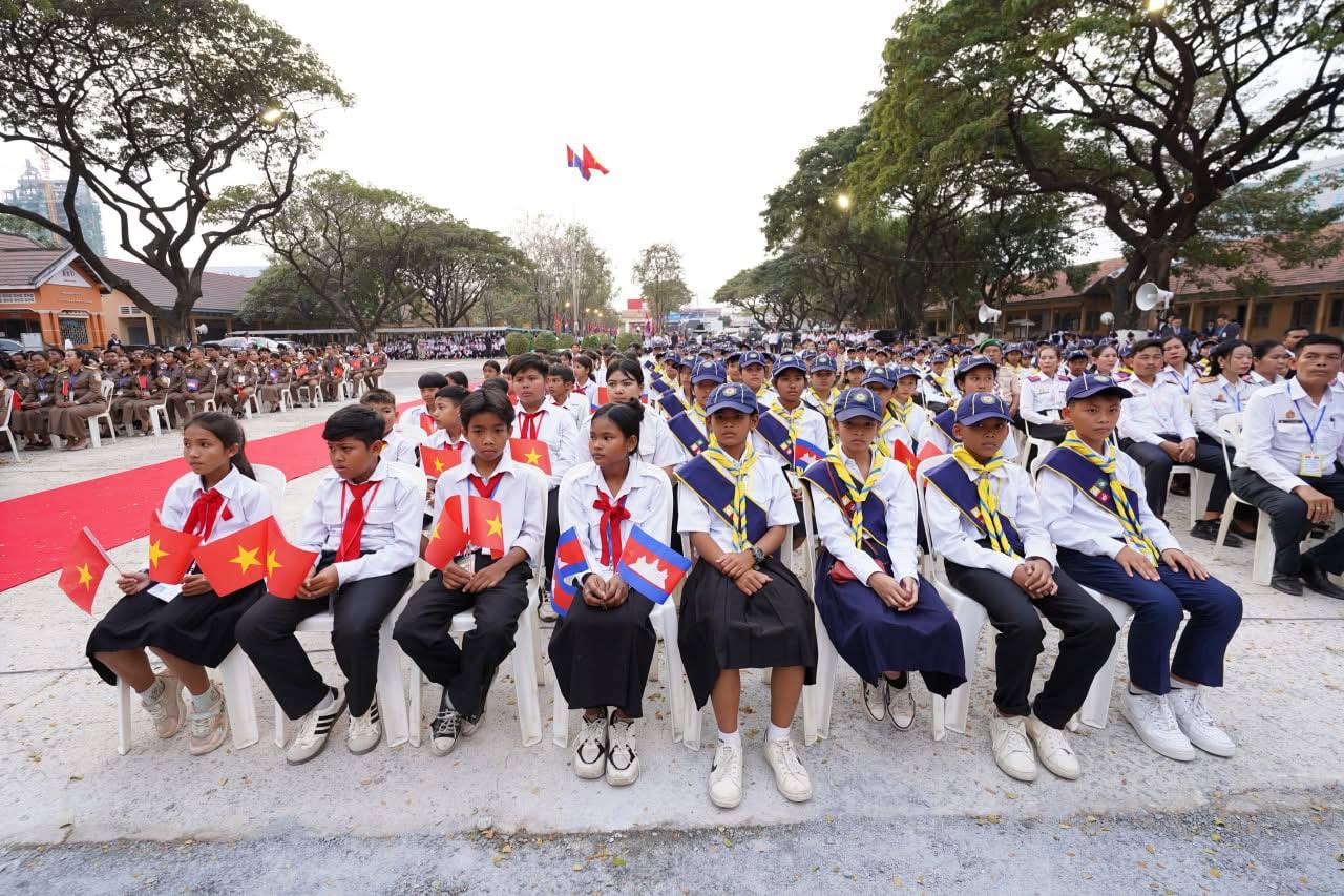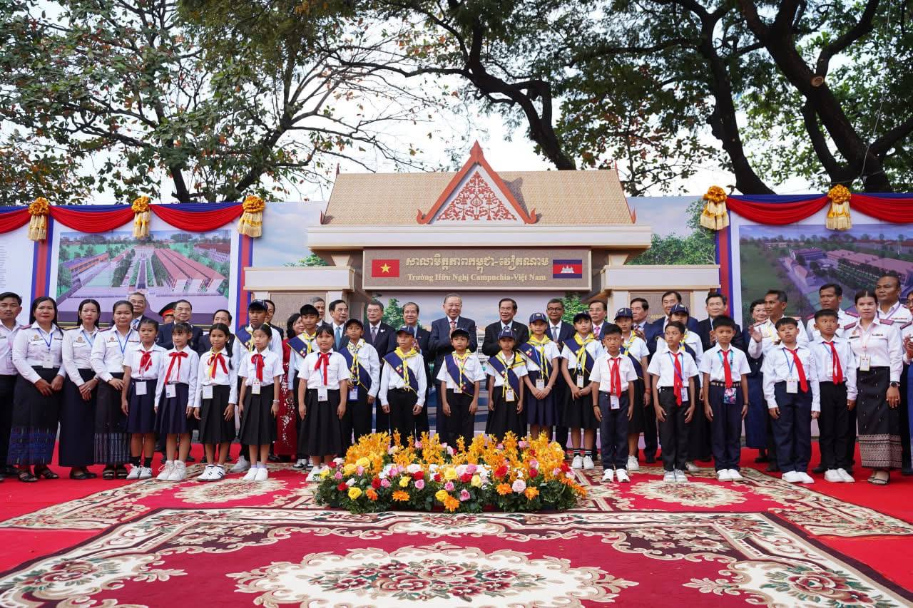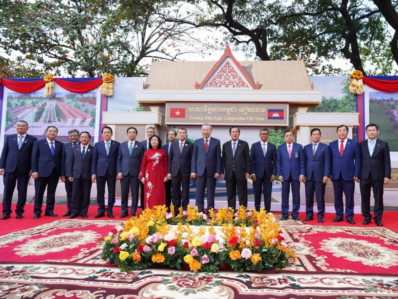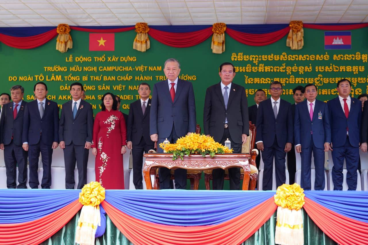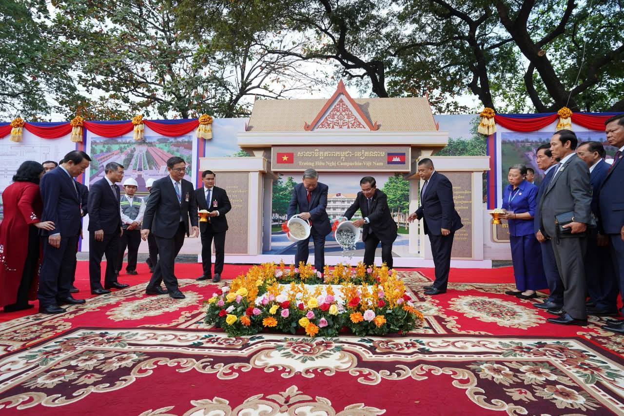 នាល្ងាចថ្ងៃទី៦ ខែកុម្ភៈ ឆ្នាំ២០២៦ សម្ដេចអគ្គមហាសេនាបតីតេជោ ហ៊ុន សែន ប្រធានព្រឹទ្ធសភា នៃព្រះរាជាណាចក្រកម្ពុជា និងឯកឧត្តម តូ ឡឹម អគ្គលេខាធិការនៃគណៈកម្មាធិការមជ្ឈិមបក្សកុម្មុយនីស្តវៀតណាម បានអញ្ជើញជាអធិបតីតីដ៏ខ្ពង់ខ្ពស់ក្នុងពិធី “បញ្ចុះបឋមសិលាសាងសង់សាលាមិត្តភាពកម្ពុជា-វៀតណាម” ស្ថិតក្នុងខណ្ឌដង្កោ រាជធានីភ្នំពេញ។