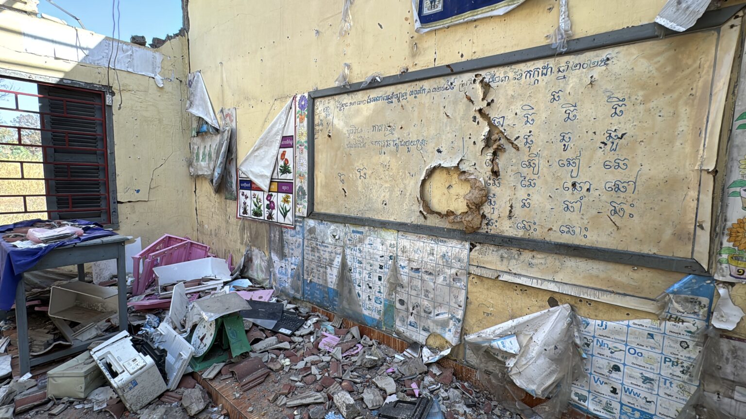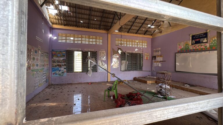 Oddar Meanchey– A primary school near the Cambodian-Thai border has been almost completely destroyed after being repeatedly shelled during two rounds of fighting, leaving hundreds of students without classrooms and raising serious concerns over the targeting of civilian infrastructure.