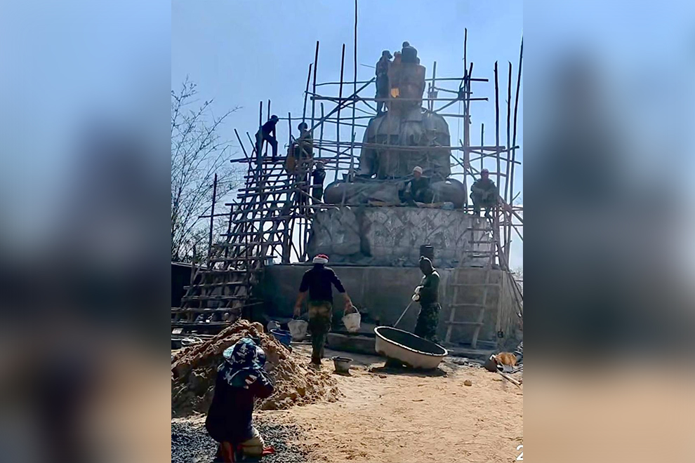 Thai workers construct an illegal Buddha statue on Cambodian land occupied by Thai forcers. Supplied