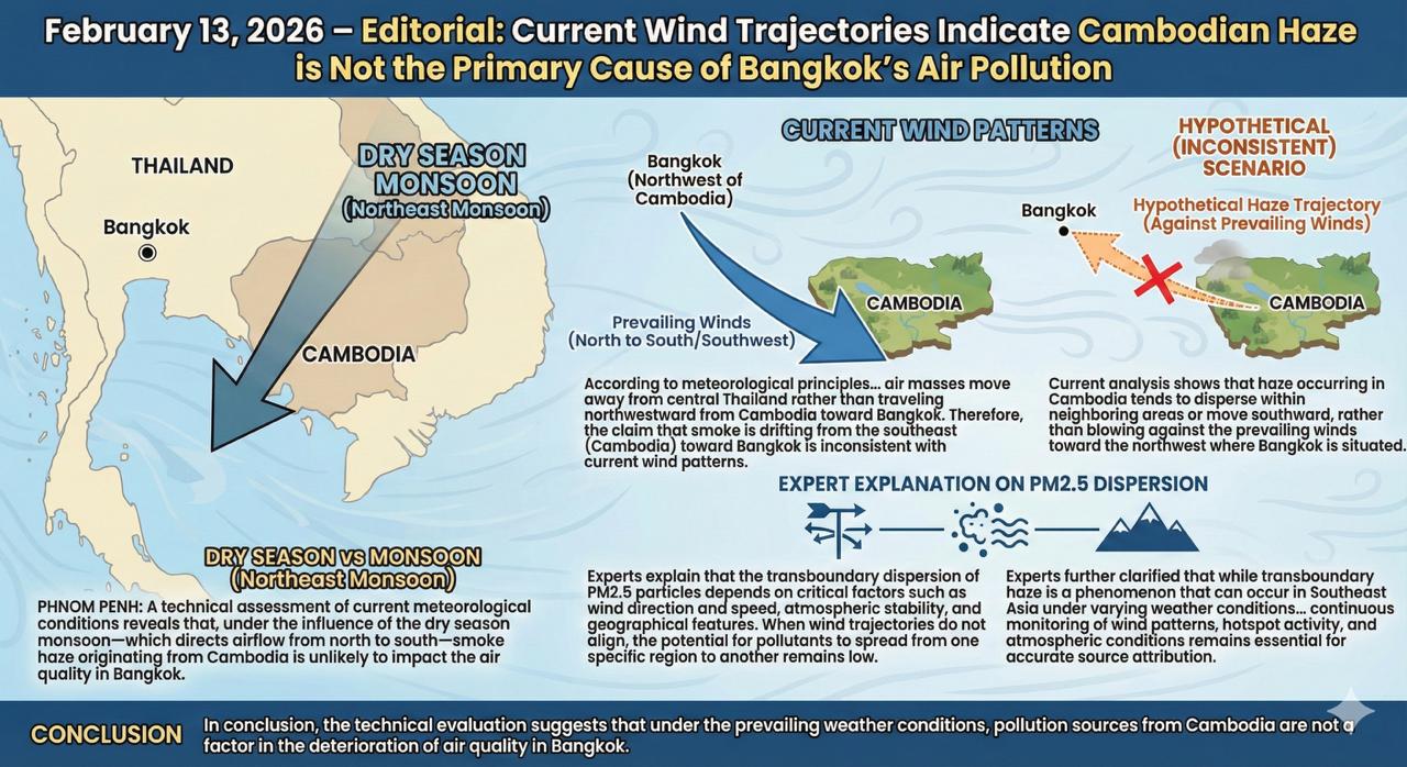 (ភ្នំពេញ)៖ ការវាយតម្លៃផ្នែកបច្ចេកទេសលើលក្ខខណ្ឌអាកាសធាតុ​បច្ចុប្បន្ន បាន​បង្ហាញ​ថា ក្រោមឥទ្ធិពលនៃរបបខ្យល់មូសុងប្រាំង ដែលមានទិសដៅខ្យល់បក់ពីទិសខាង​ជើង​ឆ្ពោះ​ទៅទិសខាងត្បូង អ័ព្ទផ្សែង ដែលមានប្រភពចេញពីប្រទេសកម្ពុជា មិនសូវមាន​លទ្ធ​ភាព​ក្នុងការបង្កផលប៉ះពាល់ដល់គុណភាពខ្យល់នៅទីក្រុងបាងកកនោះឡើយ។