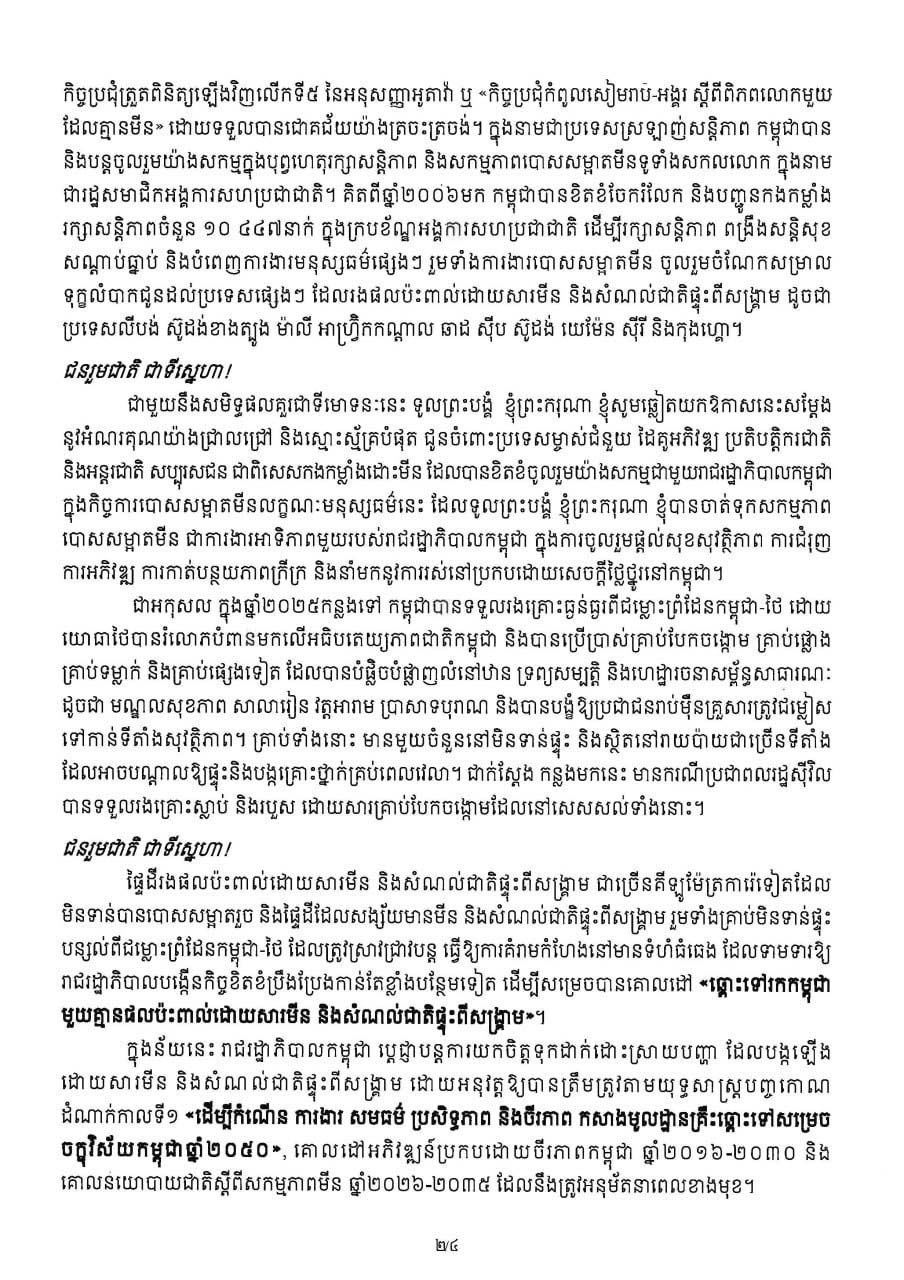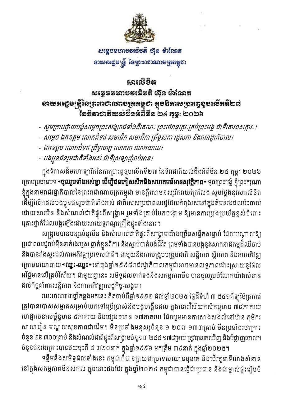 (ភ្នំពេញ)៖ សម្តេចមហាបវរធិបតី ហ៊ុន ម៉ាណែត នាយករដ្ឋមន្ត្រីនៃកម្ពុជា បានចេញសារលិខិតក្នុងឱកាសប្រារព្ធខួបលើកទី២៧ នៃទិវាជាតិយល់ដឹងអំពីមីន (២៤ កុម្ភៈ ២០២៦) ក្រោមប្រធានបទ «ចូលរួមទាំងអស់គ្នា ដើម្បីជនភៀសសឹក និងសហគមន៍មានសុវត្ថិភាព»។