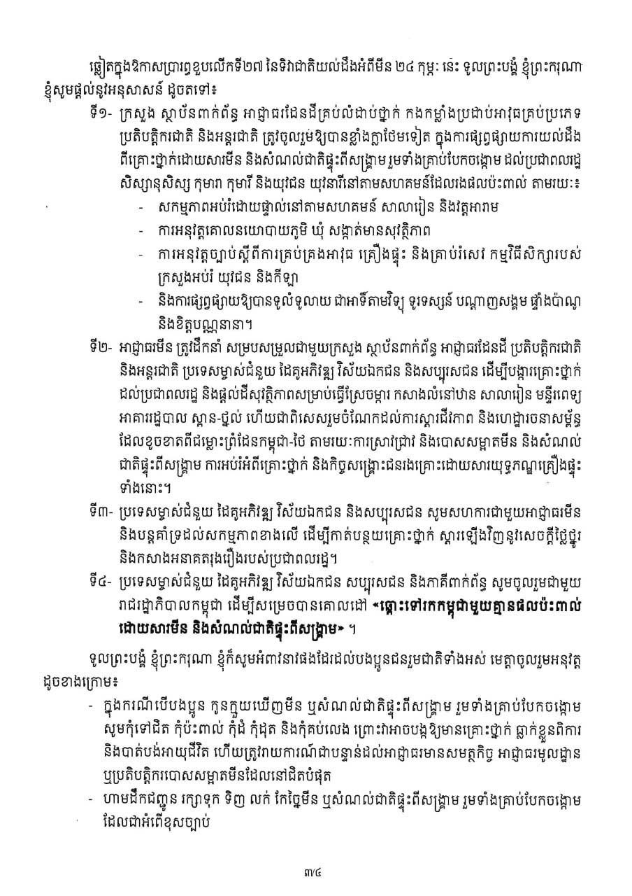 សារលិខិតរបស់សម្តេចបវរធិបតី ហ៊ុន ម៉ាណែត ក្នុងឱកាសខួបលើកទី២៧ នៃទិវាជាតិយល់ដឹងអំពីមីន ក្រោមប្រធានបទ «ចូលរួមទាំងអស់គ្នា ដើម្បីជនភៀសសឹក និងសហគមន៍មានសុវត្ថិភាព»