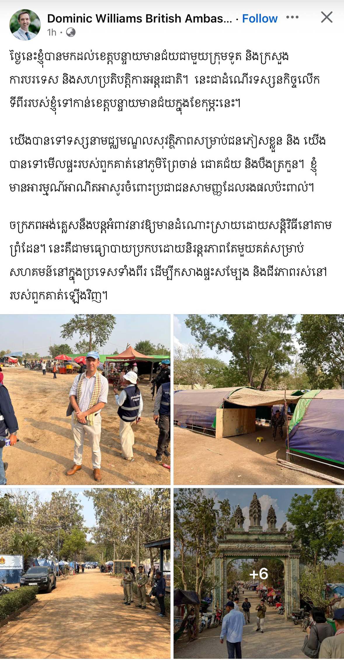 (បន្ទាយមានជ័យ)៖ លោក ដូមីនីក វិលលៀមស៍ (Dominic Williams) ឯកអគ្គរាជទូតចក្រភពអង់គ្លេស ប្រចាំព្រះរាជាណាចក្រកម្ពុជា បានលើកឡើងថា ចក្រភពអង់គ្លេសនឹងបន្តអំពាវនាវឱ្យមានដំណោះស្រាយដោយសន្តិវិធីនៅតាមព្រំដែនកម្ពុជា-ថៃ ដែលនេះគឺជាមធ្យោបាយប្រកបដោយនិរន្តរភាពតែមួយគត់សម្រាប់សហគមន៍នៅក្នុងប្រទេសទាំងពីរ ដើម្បីកសាងផ្ទះសម្បែង និងជីវភាពរស់នៅរបស់ប្រជាពលរដ្ឋខ្មែរឡើងវិញ។
