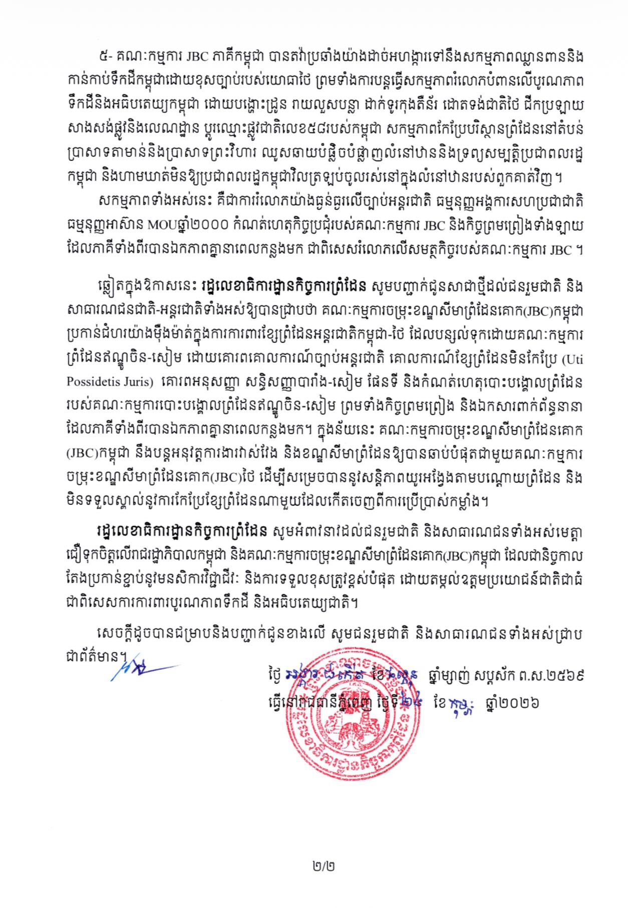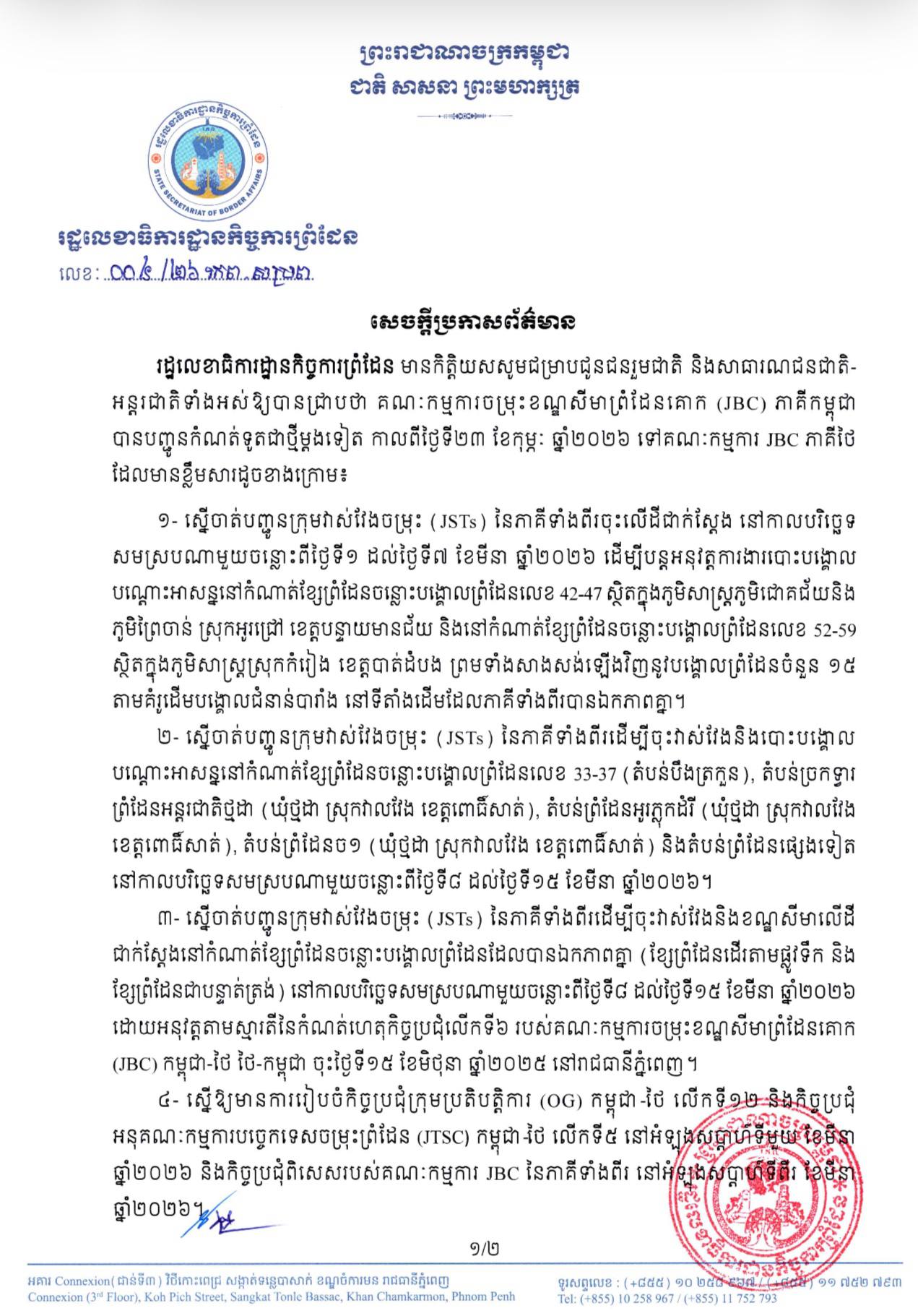 JBC ភាគីកម្ពុជា បញ្ជូនកំណត់ទូតជាថ្មីទៅ JBC ភាគីថៃ ស្នើចំនួន៤ចំណុច ដើម្បីបញ្ជូនក្រុមវាស់វែងចម្រុះ (JSTs) នៃភាគីទាំងពីរចុះលើដីជាក់ស្តែង ក្នុងអំឡុងខែមីនា ឆ្នាំ២០២៦