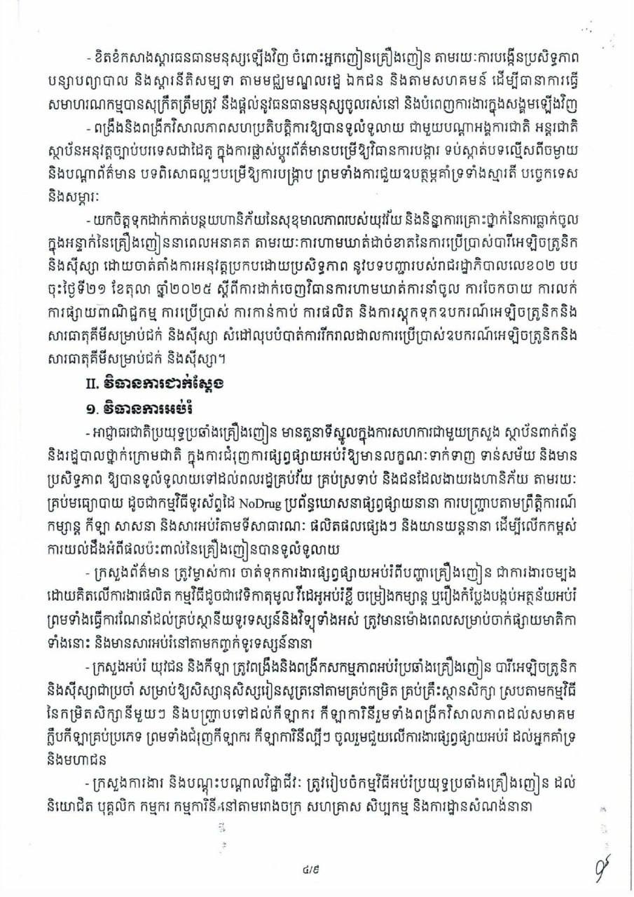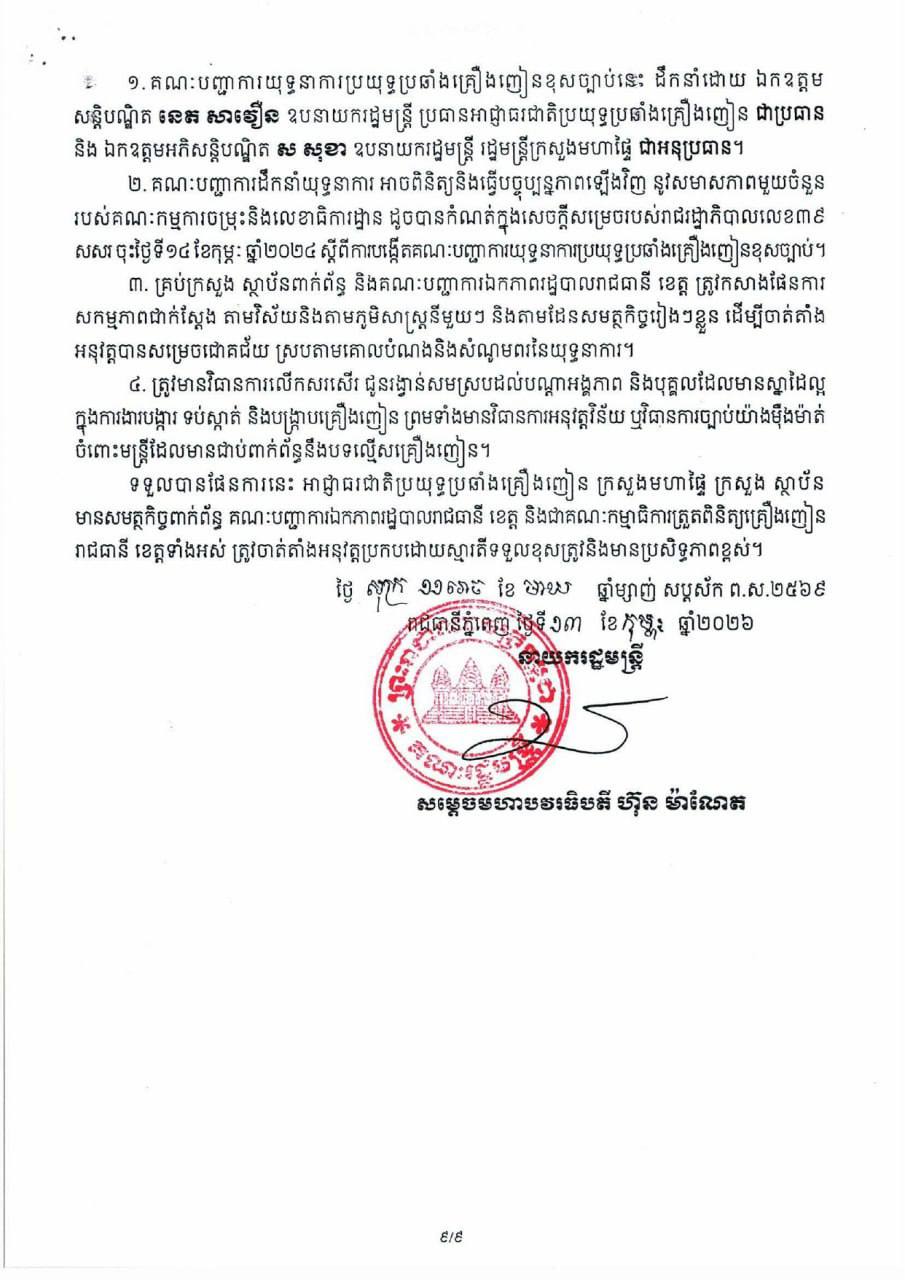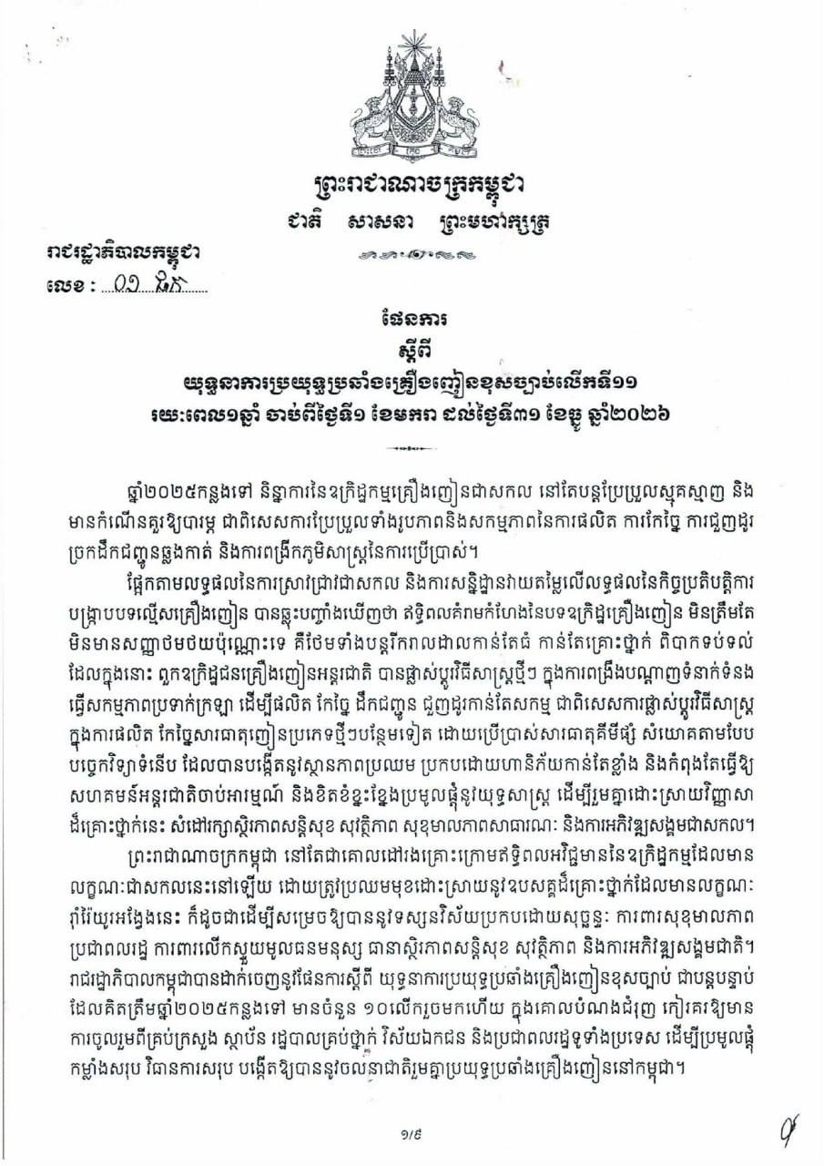 សម្ដេចធិបតី ហ៊ុន ម៉ាណែត នាយករដ្ឋមន្ដ្រីនៃកម្ពុជា បានបន្ដដាក់ចេញនូវយុទ្ធនាការប្រយុទ្ធប្រឆាំងគ្រឿងញៀនខុសច្បាប់ លើកទី១១ រយៈពេល១ឆ្នាំ ដែលអនុវត្តចាប់ពីថ្ងៃទី១ ខែមករា ដល់ថ្ងៃទី៣១ ខែធ្នូ ឆ្នាំ២០២៦