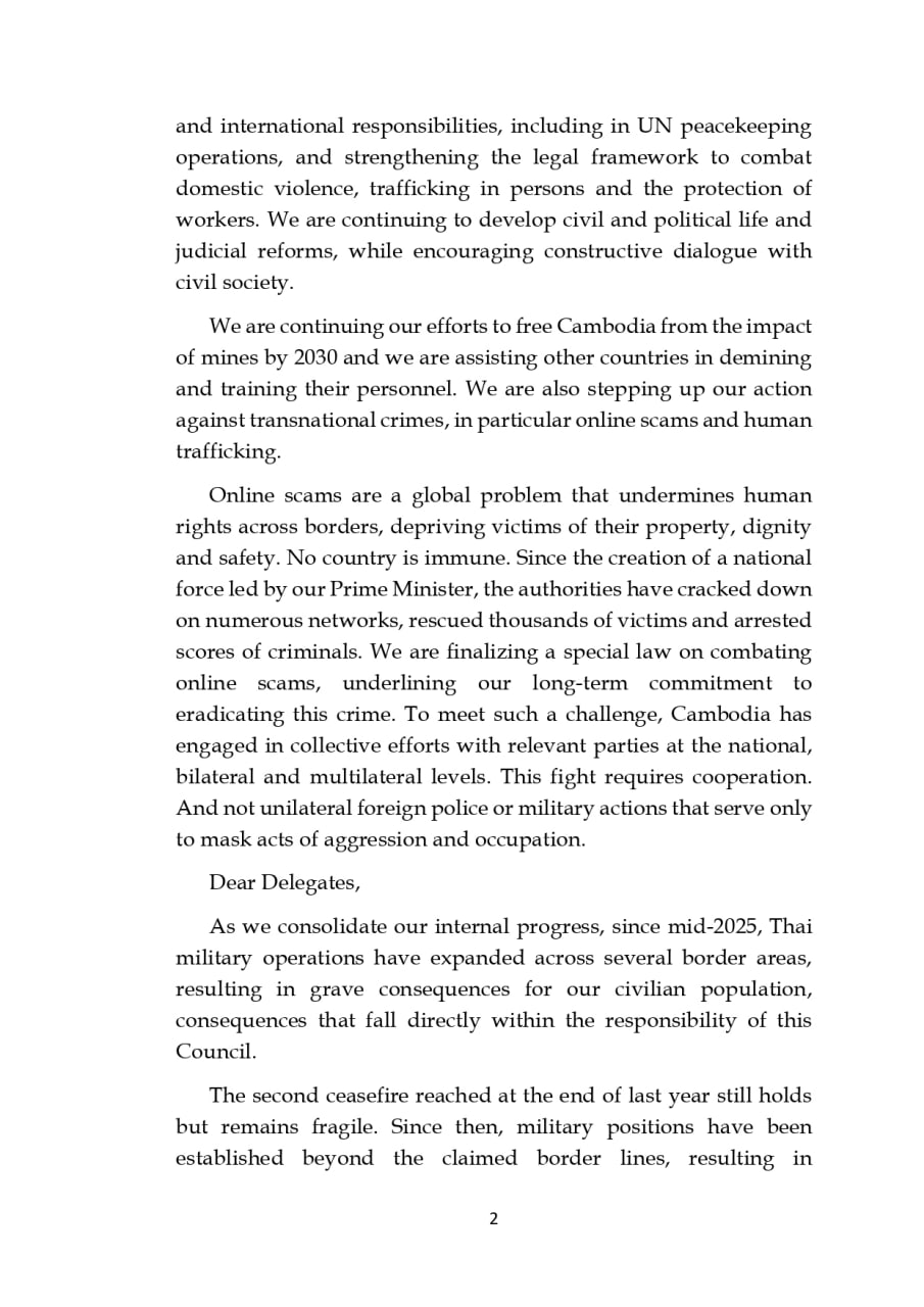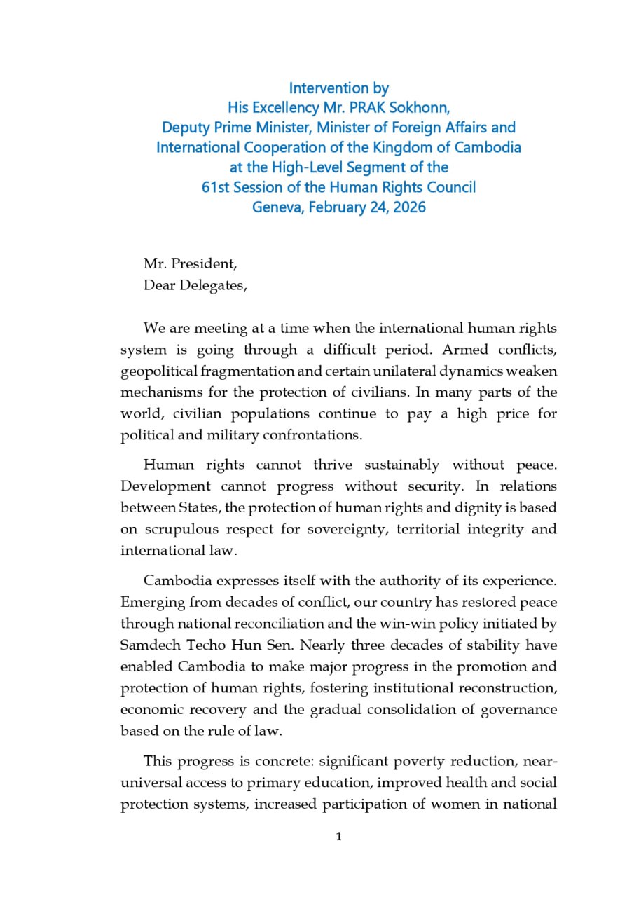 Intervention by His Excellency Mr. PRAK Sokhonn, Deputy Prime Minister, Minister of Foreign Affairs and International Cooperation of the Kingdom of Cambodia at the High-Level Segment of the 61st Session of the Human Rights Council Geneva, February 24, 2026