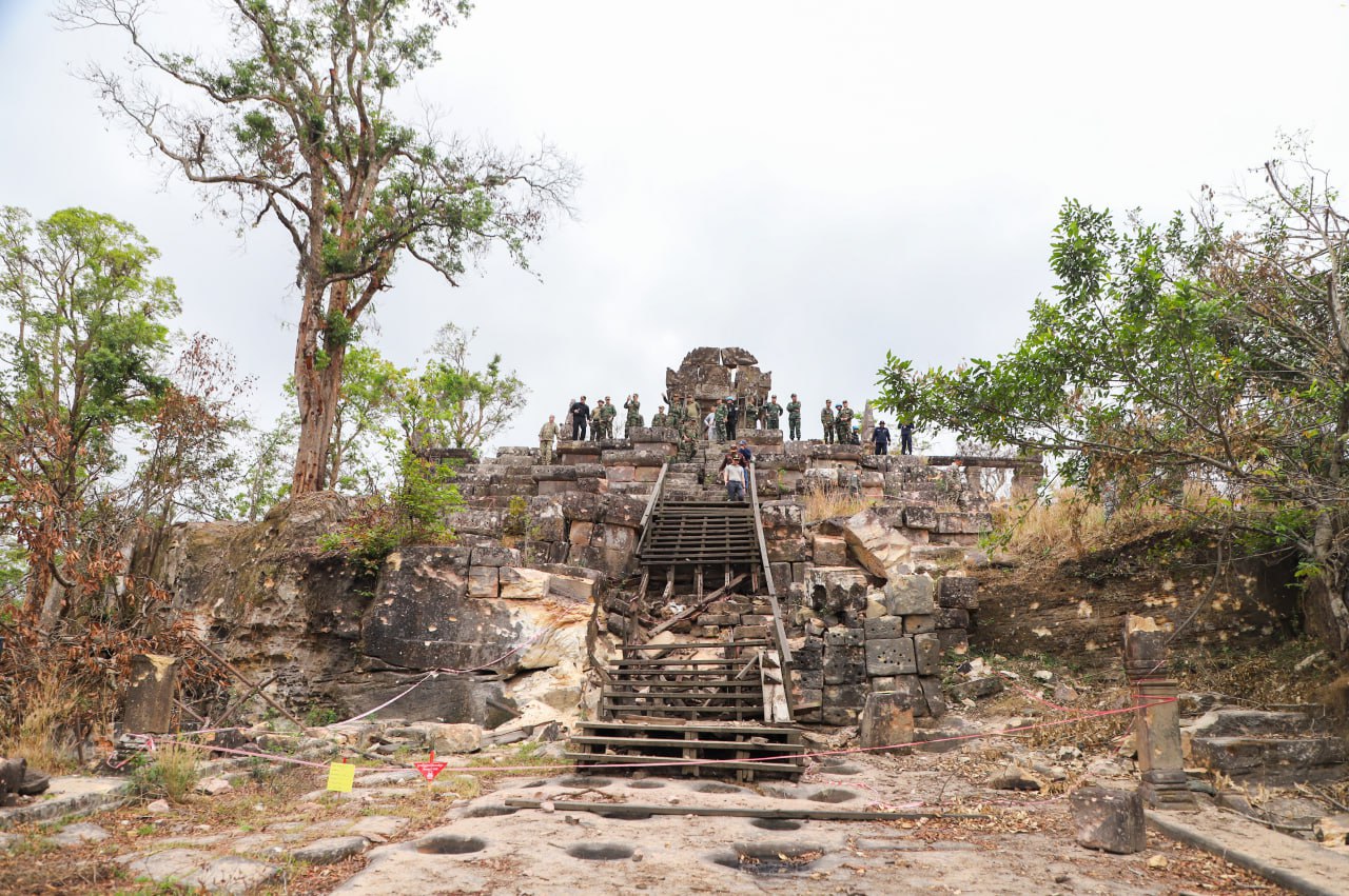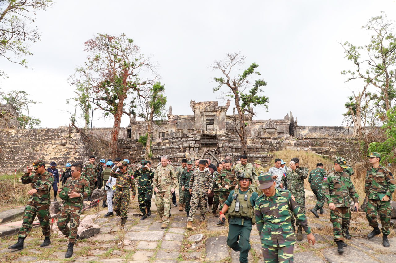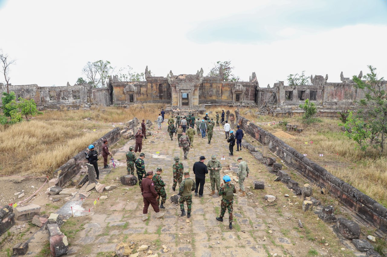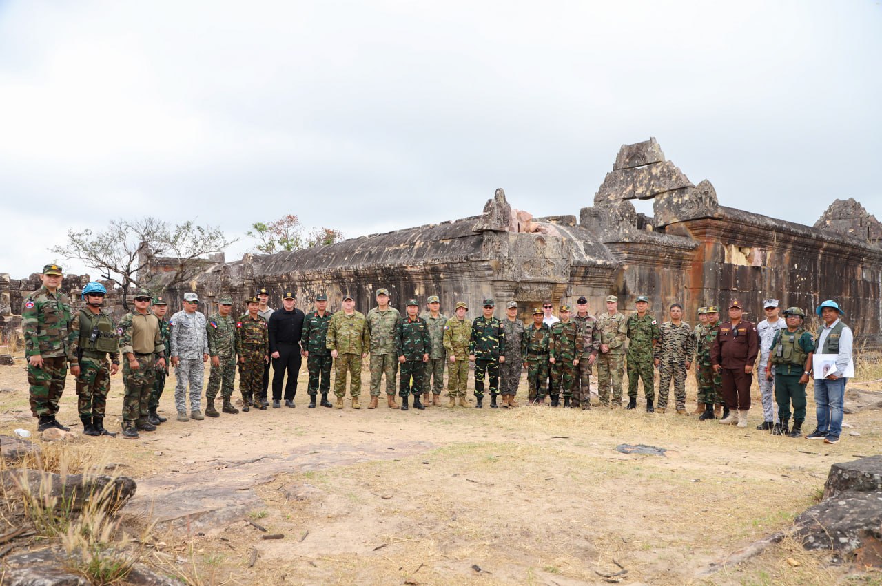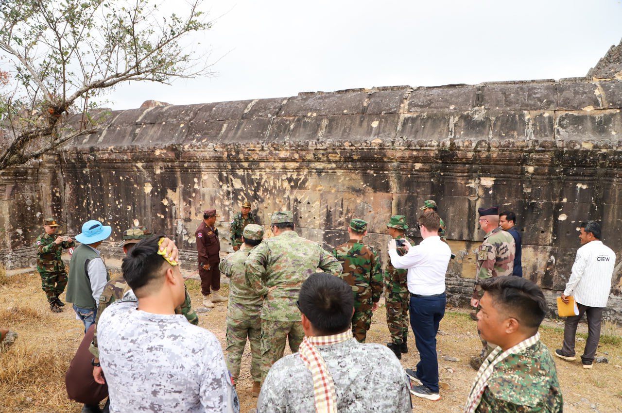 On Thursday, March 5, 2026, at 11:10 a.m., the Ministry of National Defence of the Kingdom of Cambodia coordinated with the delegations of foreign military attachés from 12 countries to visit Preah Vihear Temple and its surrounding area, located in Sra’em Commune, Choam Khsant district, Preah Vihear Province, Kingdom of Cambodia. This site is one of the most valuable World Heritage Sites of humanity and has been severely damaged by attacks carried out by Thai military forces.