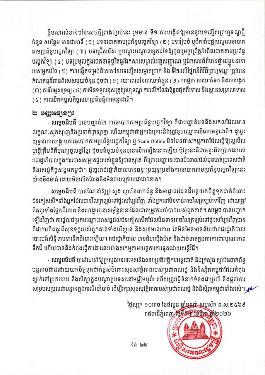 សេចក្តីប្រកាសព័ត៌មាន ស្តីពី លទ្ធផលនៃកិច្ចប្រជុំពេញអង្គគណៈរដ្ឋមន្រ្តី ក្រោមអធិបតីភាពដ៏ខ្ពង់ខ្ពស់របស់សម្តេចមហាបវរធិបតី ហ៊ុន ម៉ាណែត នាយករដ្ឋមន្ត្រី នៅថ្ងៃសុក្រ ទី១៣ ខែមីនា ឆ្នាំ២០២៦។