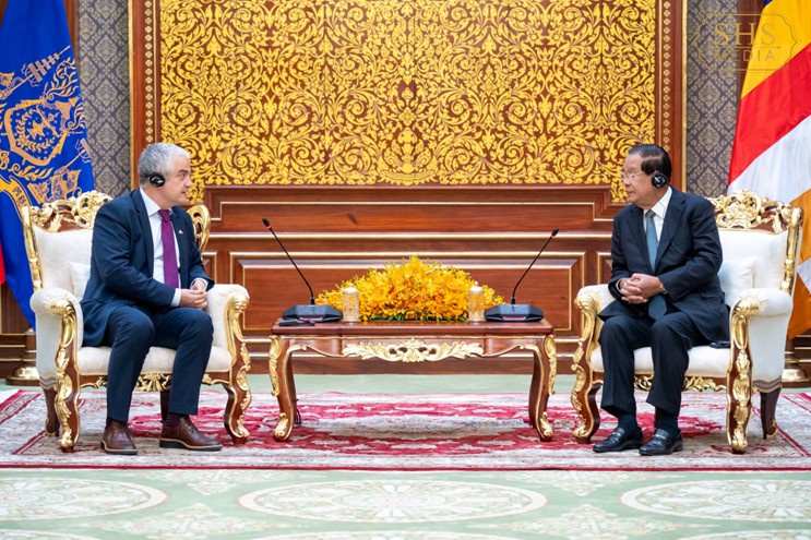 The Peace Premium: Cambodia’s Diplomatic Masterclass at the Thai Border Danish ambassador Danny Annan (left) sat down with acting head of state Hun Sen on March 16. SHS